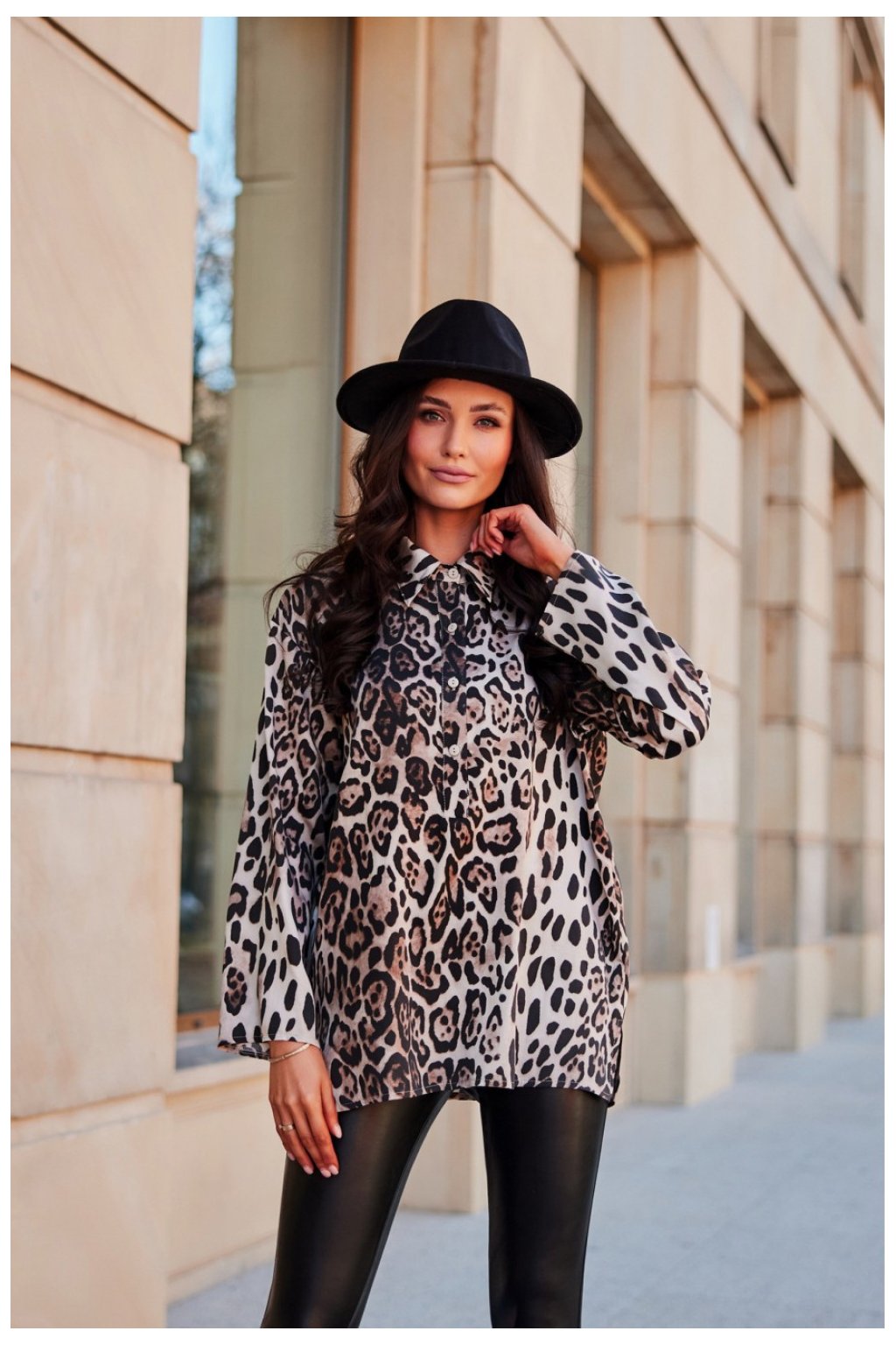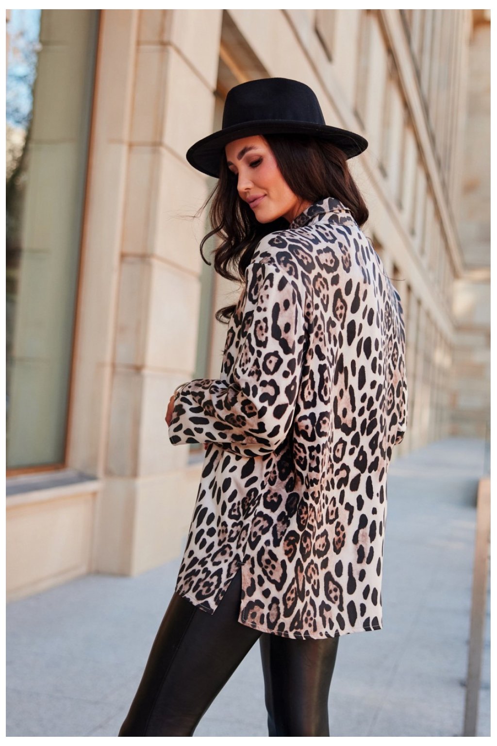 Larisa je košile vyrobena z příjemného materiálu pro pokožku v moderních vzorech. Má klasický límeček a zapíná se na knoflíky, které umožňují regulaci výstřihu. Standardní délka košile je doplněna jemnými rozparky po stranách, které dodávají volnost a lehkost. Dlouhé rukávy jemně rozšiřující se ke dnu přidávají extravagantnost a originalitu. Košile Larisa je skvělý základ pro vytvoření módního stylu na denní i večerní výstupy. Můžete ji nosit klasicky s džíny nebo zasunutou do sukně, což ještě více zdůrazní siluetu. Košile bude skvěle vypadat v kombinaci s hladkými kalhotami a také se kůží mini sukní. Produkt je vyroben a ušit v Polsku.