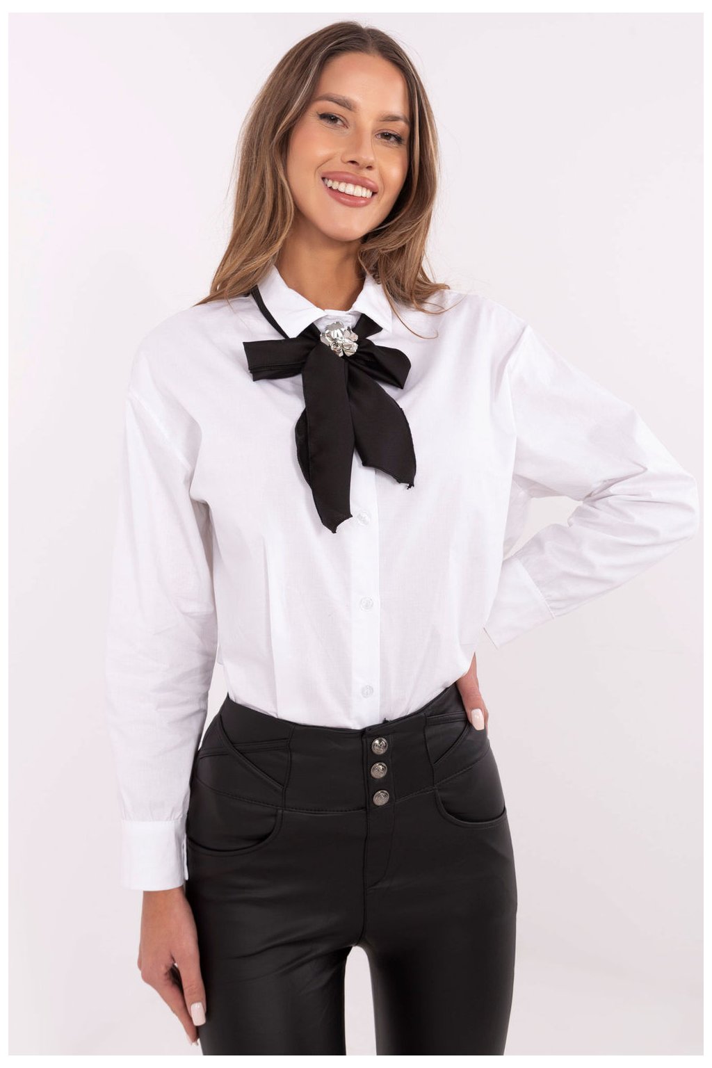 Klasická dámská košile je kvintesencí elegance a funkčnosti, skvělá na každý den, do práce nebo na společenské události. Vyrobená z vysoce kvalitní bavlny, poskytuje pohodlí přes den a skvěle se přizpůsobuje postavě. Hladká tkanina zdůrazňuje její univerzální charakter, čímž se stává nezbytnou součástí každého šatníku. Model s standardní délkou, dlouhými rukávy a klasickým límečkem se vyznačuje doplňky, které dávají košili výjimečný styl. Přiložená brož a šála, které lze sundat, umožňují personalizaci stylizace od minimalistické klasiky po více ozdobný, módní vzhled. Zapíná se na knoflíky a skvěle ladí jak s elegantními kalhotami, tak s sukněmi, nabízí mnoho možností stylizace. Je to skvělá volba pro ženy, které ocení nadčasový styl s nádechem moderních detailů.