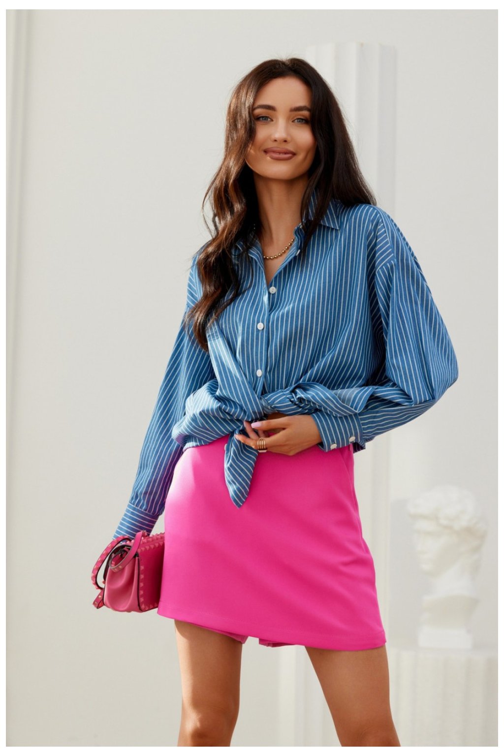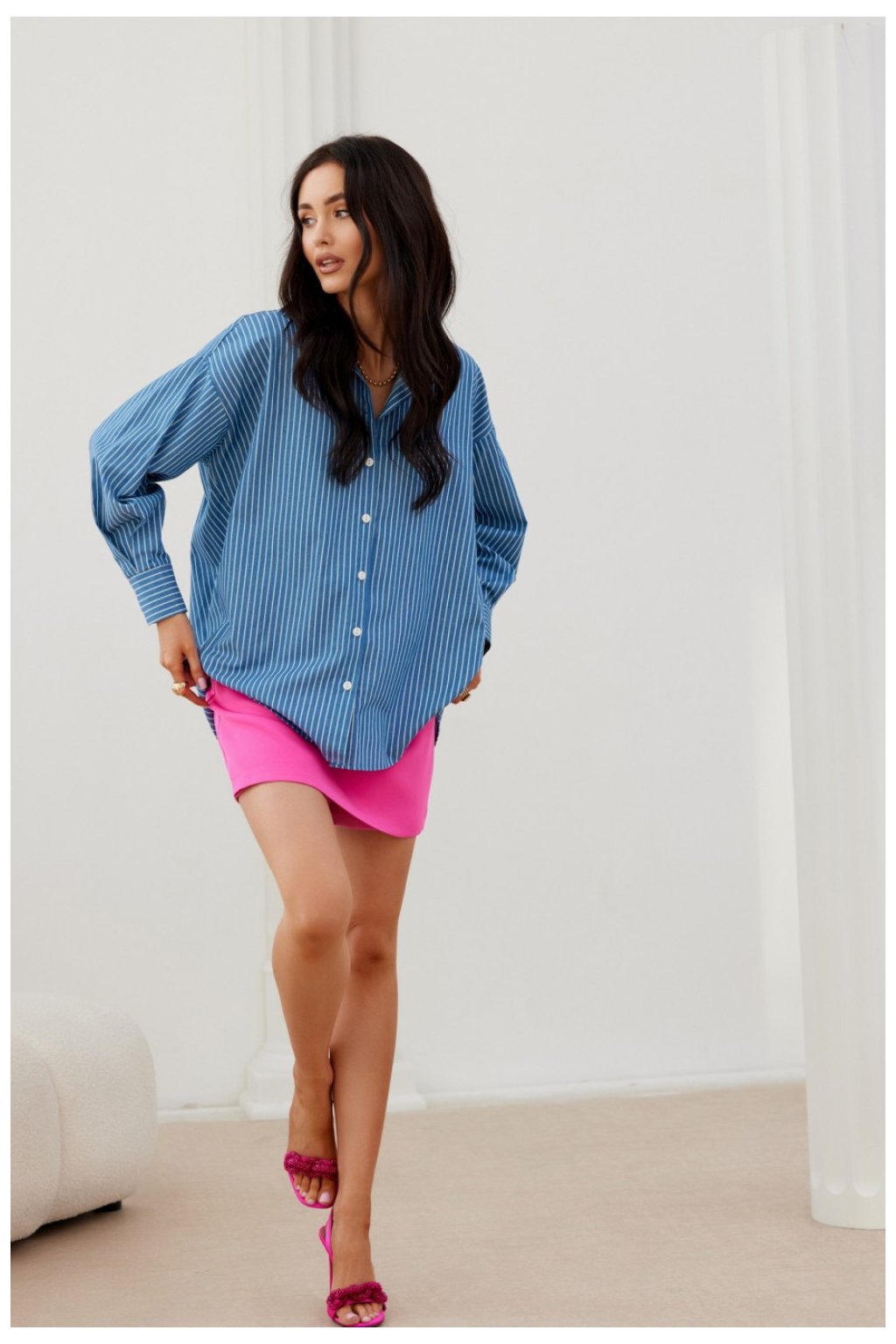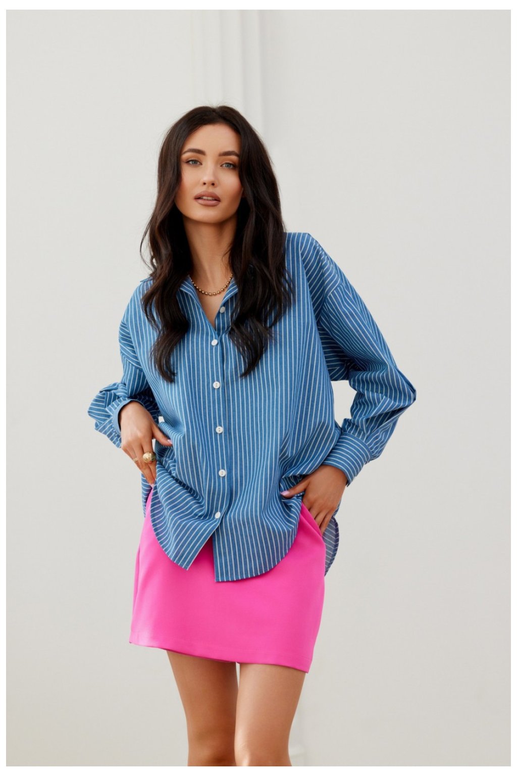 Košile typu oversized s dlouhými rukávy zakončenými ozdobnými manžetami zapnutými na knoflíky. Má asymetrický střih, zapíná se na knoflíky.