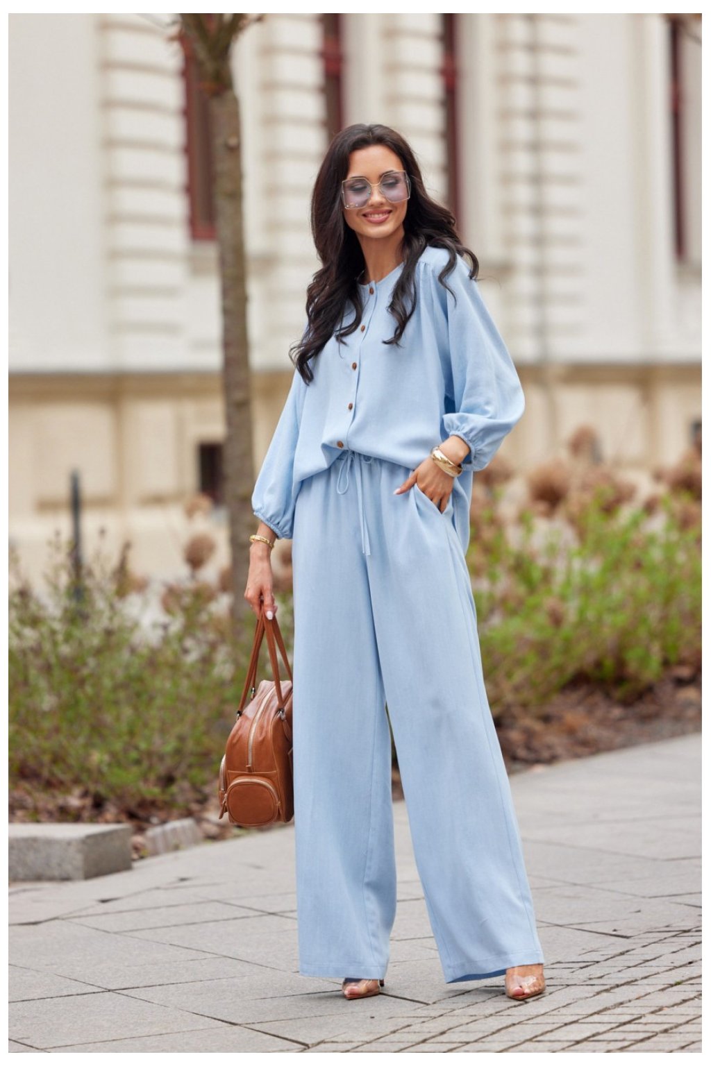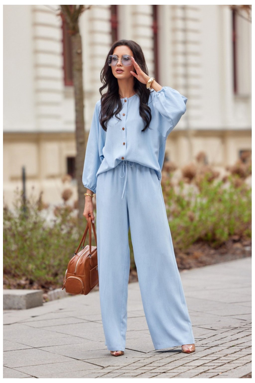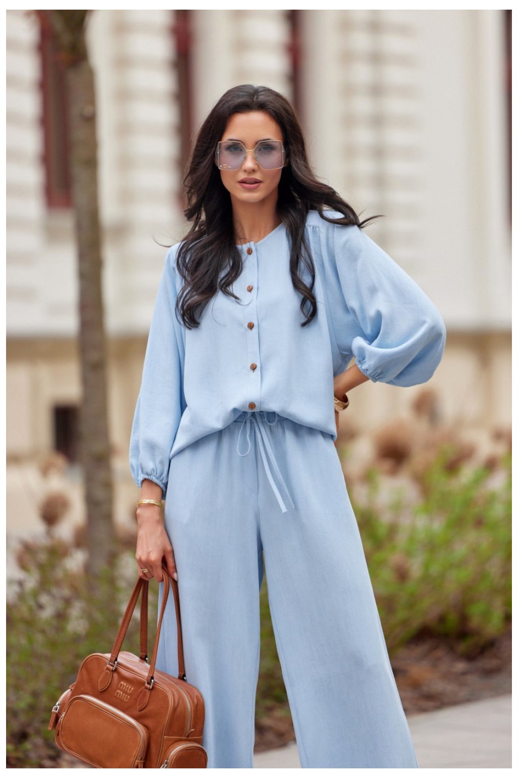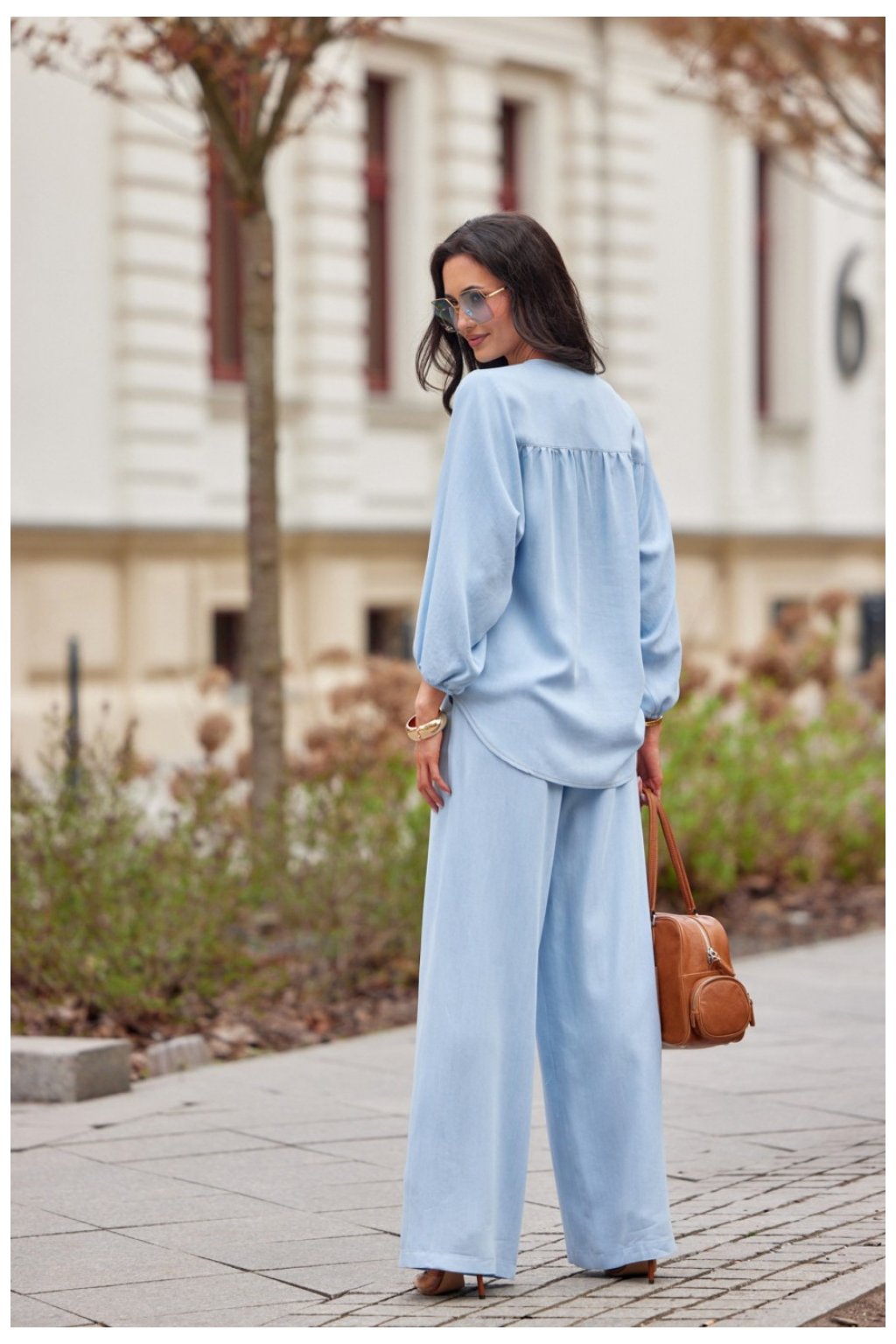 Halenní košile s volným střihem a objemnými rukávy. Zapínání vpředu na knoflíky umožňuje regulaci výstřihu. Střih košile, zadní část mírně prodloužená.
