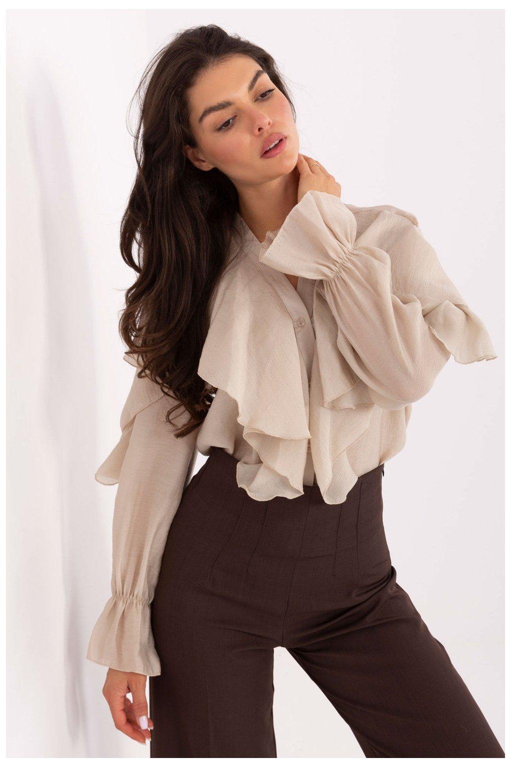 Klasická dámská košile v elegantním stylu, ideální na každodenní nošení, do práce i na společenské události. Vyrobená z kombinace lyocellu a polyesteru spojuje pohodlí, lehkost a odolnost. Model s standardní délkou a výstřihem na srdíčko s knoflíkovým zapínáním byl obohacen o efektní žabot a jemné volánky na přední straně, které dodávají celku ženský a stylový charakter. Dlouhé rukávy s volánkem na konci zdůrazňují eleganci a jedinečnost tohoto návrhu.