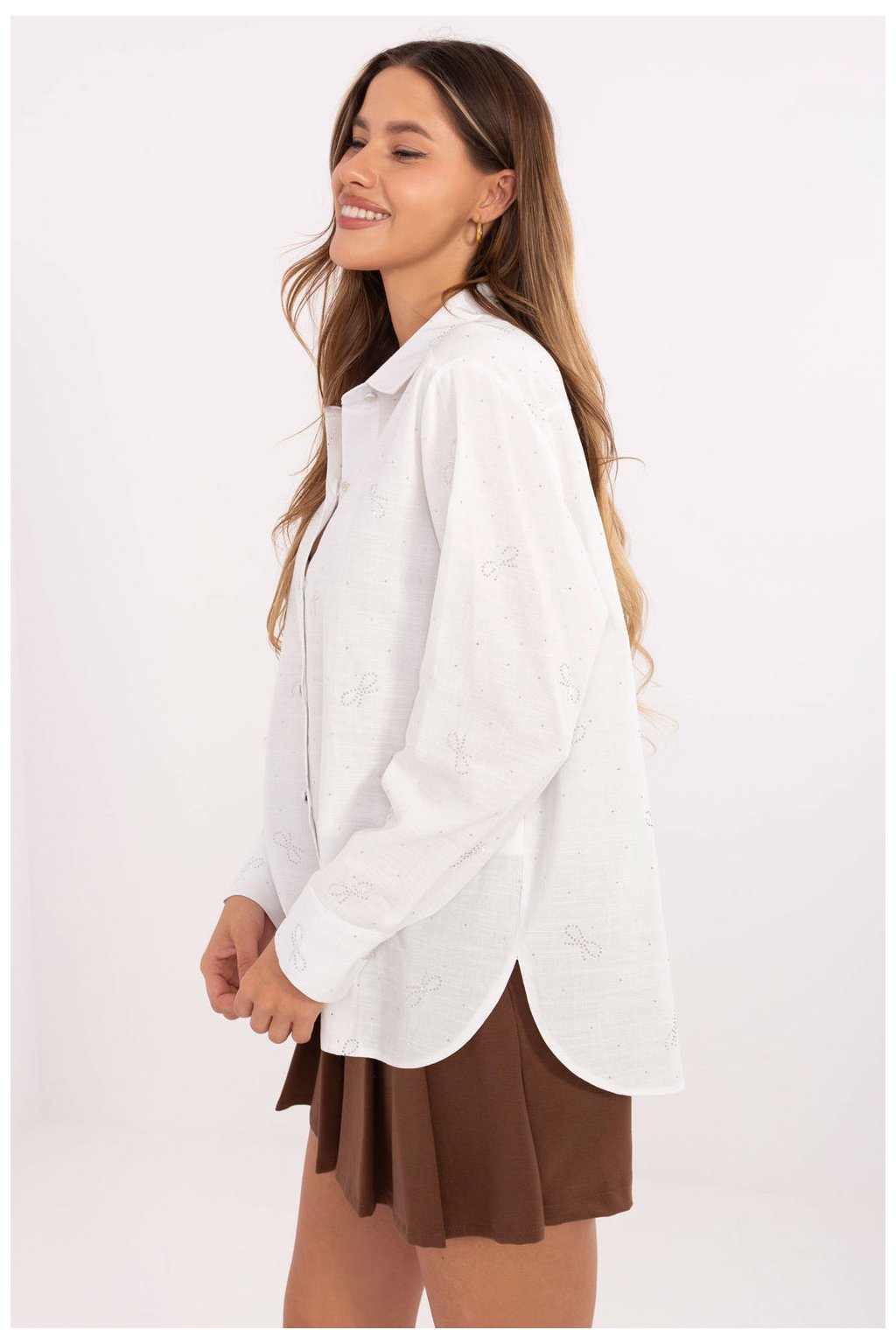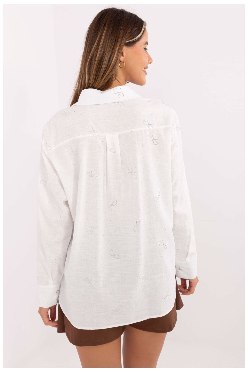 Elegantní a ženská košile s klasickým střihem, ideální na každý den, do práce nebo na speciální příležitosti. Vyrobena z vysoce kvalitní viskózy s přídavkem elastanu, poskytuje pohodlí a skvělé přizpůsobení postavě. Po celé ploše látky je jemná aplikace z lesklých flitrů, která dodává celku jedinečný charakter a eleganci. Košile má standardní délku, klasický límeček a zapínání na knoflíky. Dlouhé rukávy s manžetami dodávají šarm a všestrannost. Je to ideální volba pro ženy oceňující spojení elegance a pohodlí, skvěle se hodí jak do kanceláře, tak na schůzky nebo speciální příležitosti.