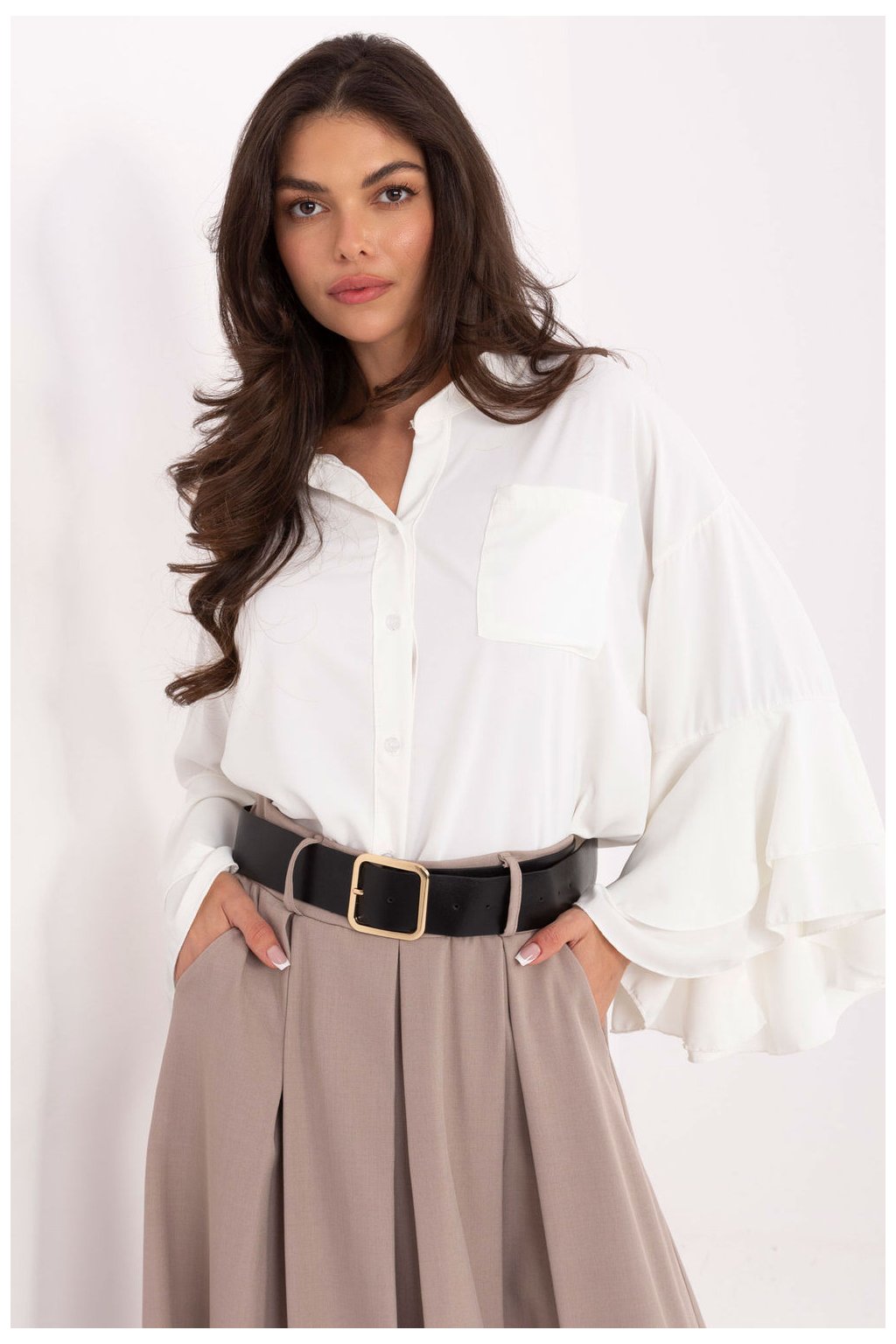 Elegantní dámská košile s elegantním a zároveň moderním charakterem. Ideální na každý den, do práce a na společenské události. Vyrobená z lehkého, příjemného polyesteru s elastanem, který skvěle padne a poskytuje pohodlí po celý den. Model se vyznačuje hladkou látkou a kratším střihem, který zdůrazňuje ženskou siluetu. Místo tradičního límce má košile elegantní stojáček a klasické zapínání na knoflíky jí dodává nadčasový styl. Dlouhé rukávy jsou zakončeny jemnými volány, které dodávají celku lehkost a jemný romantismus. Na hrudi je praktická kapsa, která zároveň představuje stylový doplněk. Skvělá volba pro ženy, které ocení eleganci v každodenním provedení, skvěle se hodí jak do kanceláře, tak i na setkání nebo výstupy v formálnějším tónu.