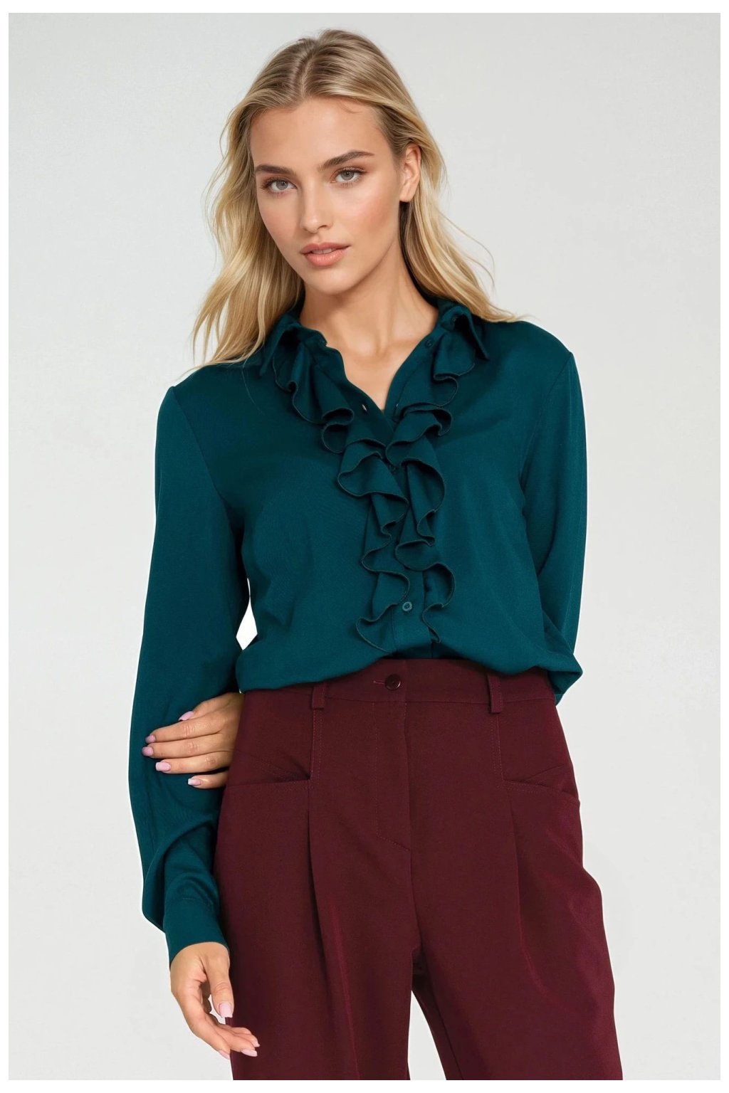 Dámská košile s přiléhavým střihem fit, elegantně zdůrazňující postavu. Vybavená klasickým límečkem a dlouhým rukávem, představuje nadčasovou základnu pro styling. Model se zapíná na knoflíky, obohacený efektním ozdobným jabotem, který dodává celku výjimečný ženský charakter. Ideální volba jak do kanceláře, tak na speciální příležitosti, kde záleží na eleganci a jemném stylu.