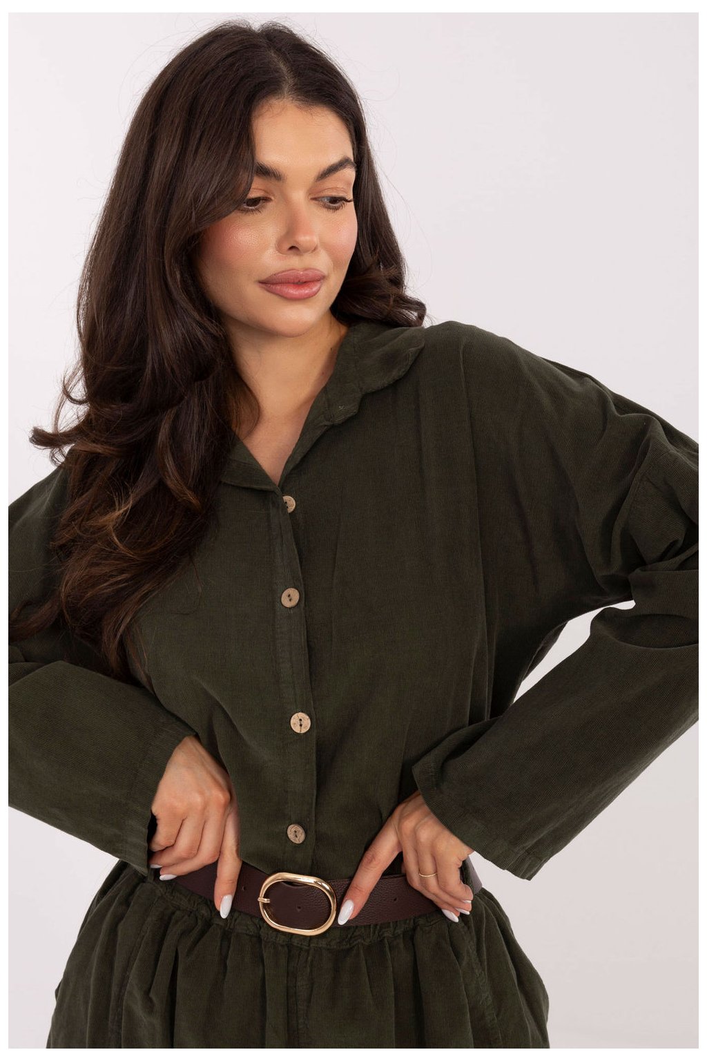 Elegantní dámská košile s casual charakterem, ideální na každý den. Vyrobená z příjemného na dotek žinýrového materiálu s dominujícím polyesterem, který se vyznačuje různorodou fakturou a jemným leskem. Model má klasický límeček a dlouhý rukáv, a zapínání na knoflíky mu dodává nadčasový a elegantní vzhled. Standardní délka dělá košili skvěle sladitelnou jak s džíny, tak s kalhotami s vysokým pasem. Ideální nabídka pro pohodlné, módní a univerzální casual stylizace.