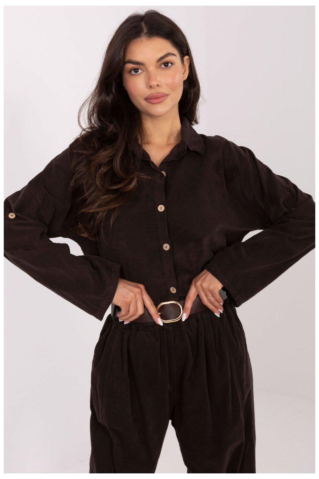 Elegantní dámská košile s ležérním charakterem, ideální na každý den. Vyrobená z příjemného dotyku žebrového materiálu s dominujícím polyesterem, který se vyznačuje různorodou strukturou a jemným leskem. Model má klasický límec a dlouhý rukáv, a knoflíkové zapínání mu dodává nadčasový elegantní vzhled. Standardní délka zajišťuje, že se košile skvěle hodí jak k džínům, tak k kalhotám s vysokým pasem. Ideální volba pro ležérní outfit, pohodlná, stylová a univerzální.