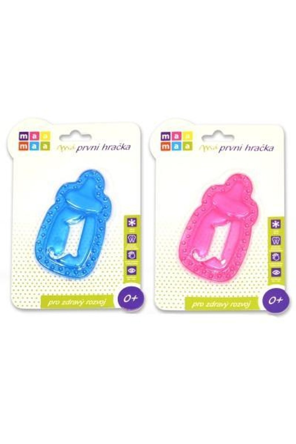 Chladící kousátko ve tvaru láhve je dodáváno ve dvou barevných provedeních - modrá a růžová. Kousátko je vyrobeno z měkkého materiálu, je plněný nezávadným gelem. Skvělá stimulace bolavých dásní.