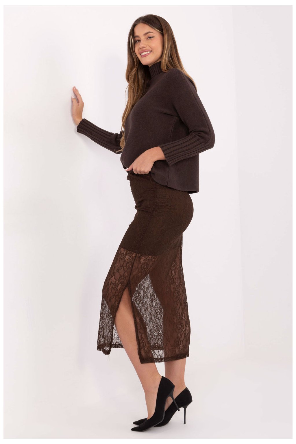 Elegantní středně dlouhá krajková sukně, držená v elegantním a ženském stylu. Vyrobená z vysoce kvalitního materiálu, nylonu s přídavkem spandexu, který se jemně přizpůsobí postavě, zajistí pohodlí při nošení. Model má průhledný vzor, který dodává celku jemný a efektní charakter. V pasu je vsazena elastická guma, díky čemuž se sukně dokonale přizpůsobí pasu a není potřeba ji zapínat. V horní části je podšívka, což zaručuje pohodlí a dostatečné krytí, zachování lehkosti a ženského šarmu krajk. Je to ideální volba jak na každý den, do práce, tak i na elegantní společenské události, elegantní, stylová a neuvěřitelně pohodlná.