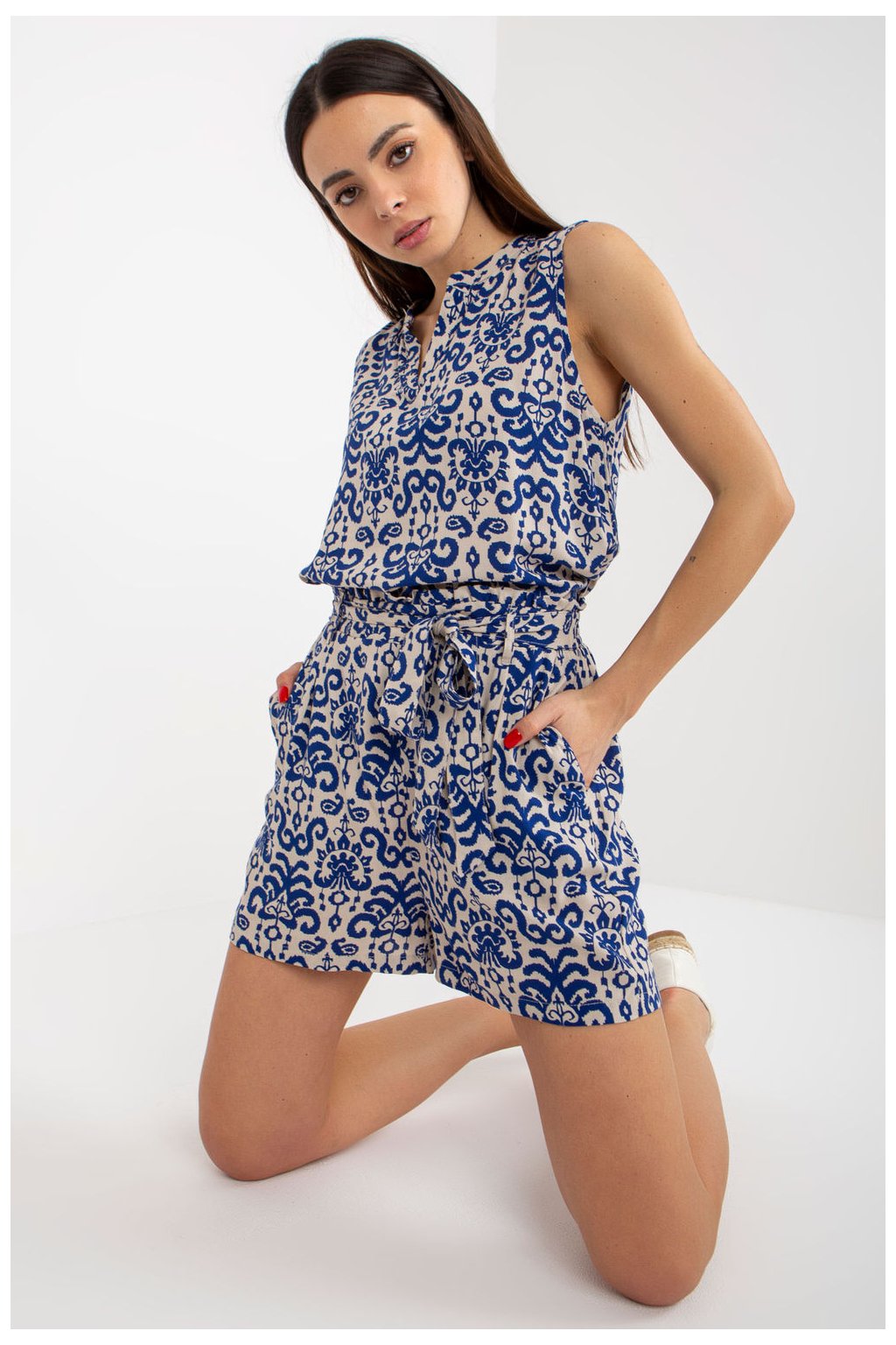 Dámské šortky s vysokým pasem a zavazováním v pase. Na bocích jsou nakládané kapsy.