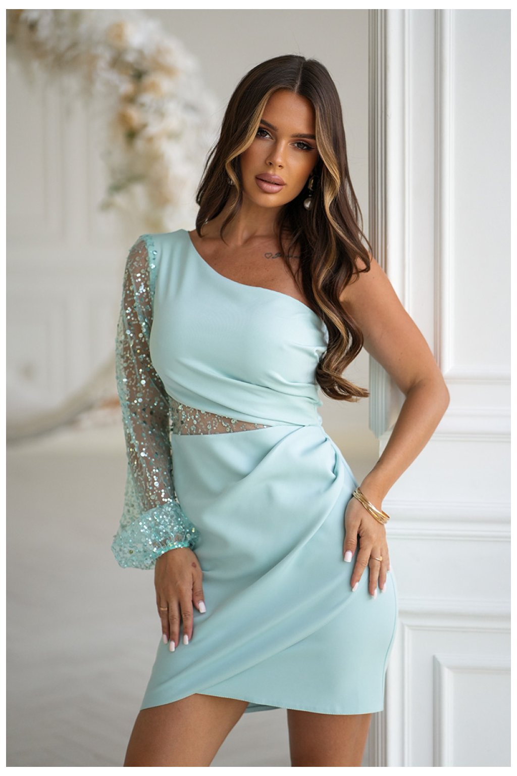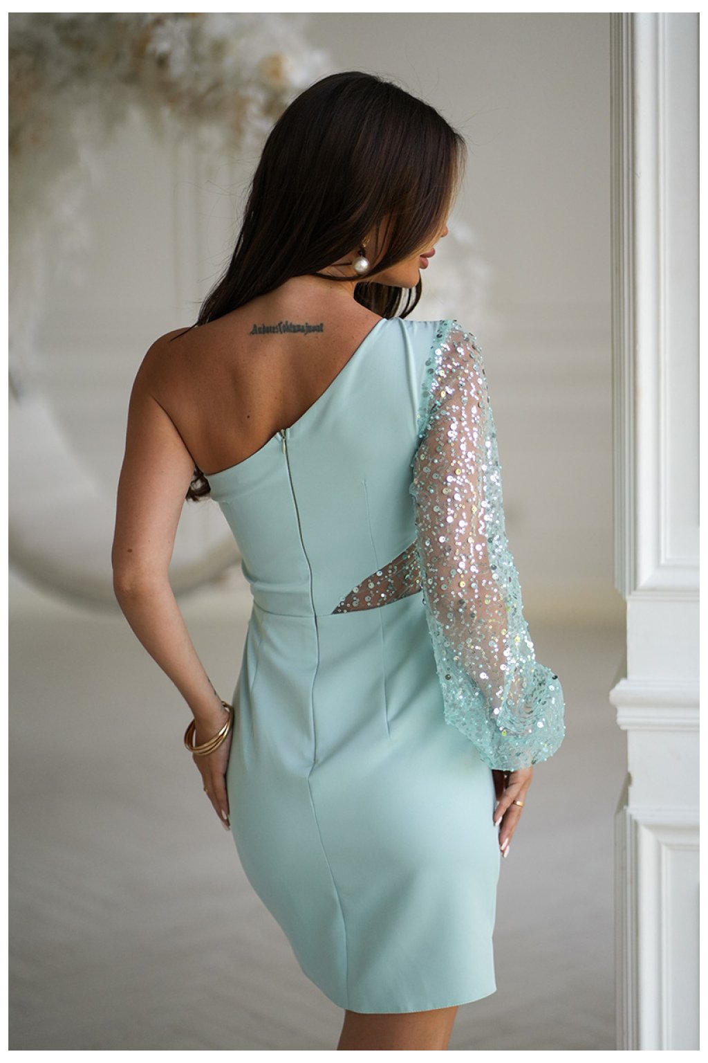 Mini šaty s krásným cekínovým rukávem na jedno rameno. Horní část asymetrická, také s cekínovým vložením. Spodek kreace krátký, hladký a zmačkaný. Šaty mají podšívku, zapínají se na skrytý zip. Šaty ideální na elegantní večírky.Složení: