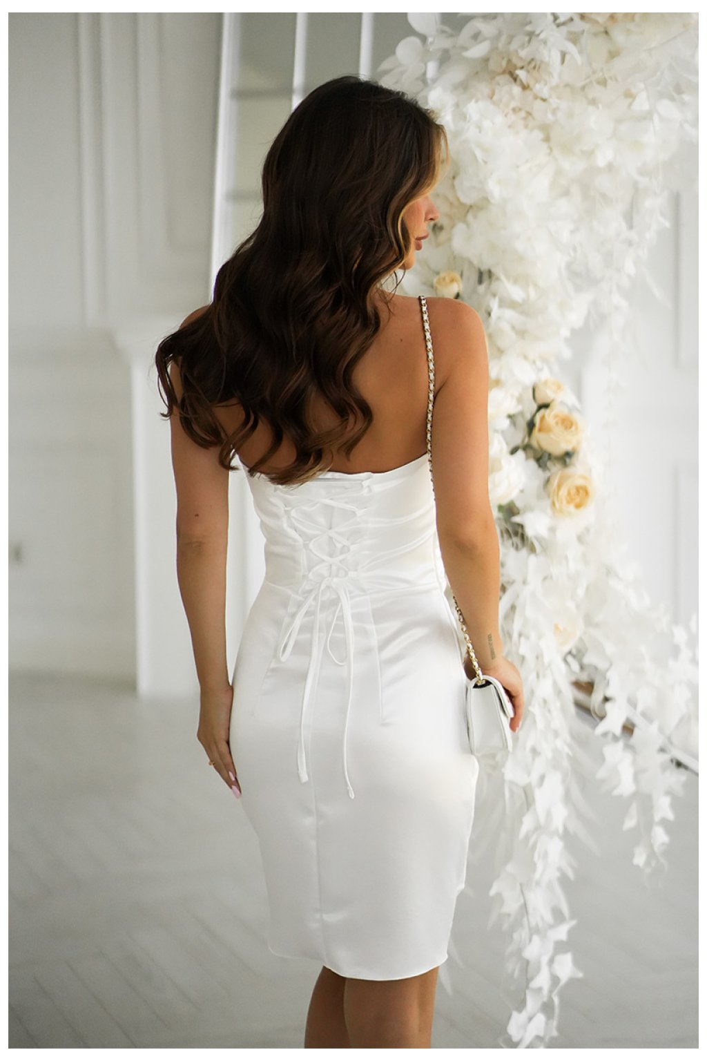 Elegantní šaty z lesklého saténu, bez ramínek, zdobené velkou, drapovanou růží umístěnou na hrudi. Přiléhavý střih krásně zdůrazňuje postavu a jemný lesk látky jí dodává výjimečný charakter. Ideální na speciální příležitosti a večerní vycházky. Šaty se zapínají na skrytý zip, co usnadňuje oblékání a svlékání kreace.