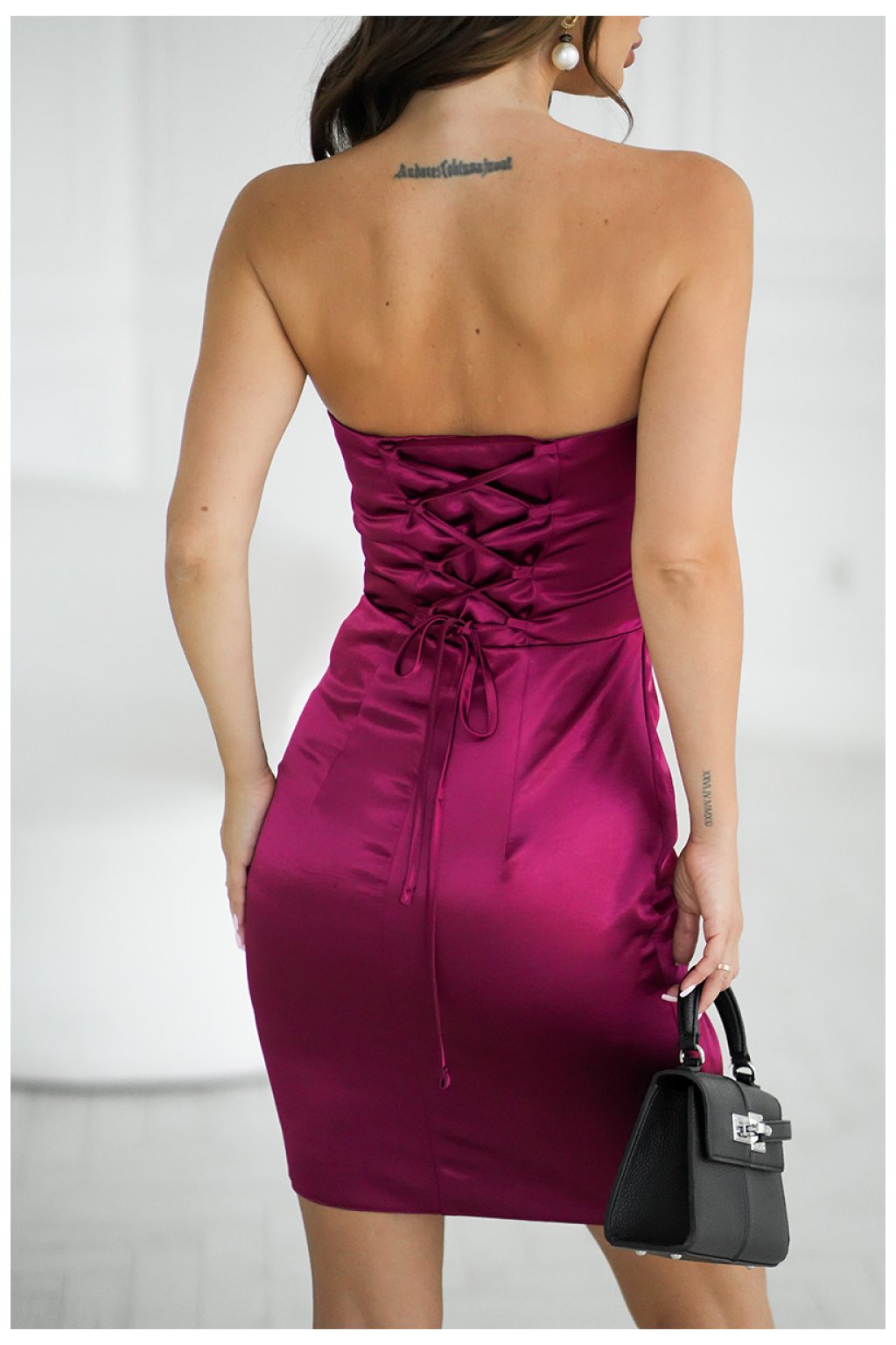 Elegantní šaty z lesklého saténu, bez ramínek, zdobené velkou, drapírovanou růží umístěnou na hrudi. Přizpůsobený střih krásně zdůrazňuje siluetu a jemný lesk látky jí dodává výjimečný charakter. Ideální na speciální příležitosti a večerní vycházky. Šaty se zapínají na skrytý zip, co usnadňuje oblékání a svlékání kreace.