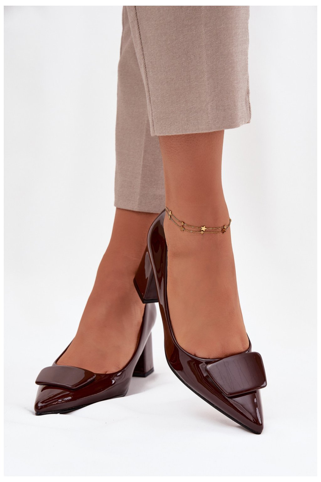 Lodičky vyrobené z ekokože jsou klasickým návrhem, který kombinuje nadčasovou eleganci s pohodlím nošení. Model s pevným sloupkovým podpatkem zajistí pohodlí po celý den a špičaté špičky opticky prodlužují nohy, zdůrazňujíce ženský charakter. Vepředu je ozdobný detail. Jsou to ideální lodičky pro elegantní stylizace, skvěle se hodí jak do práce, tak na výjimečné příležitosti, skvěle ladí s šaty, sukněmi a klasickými kalhotami.