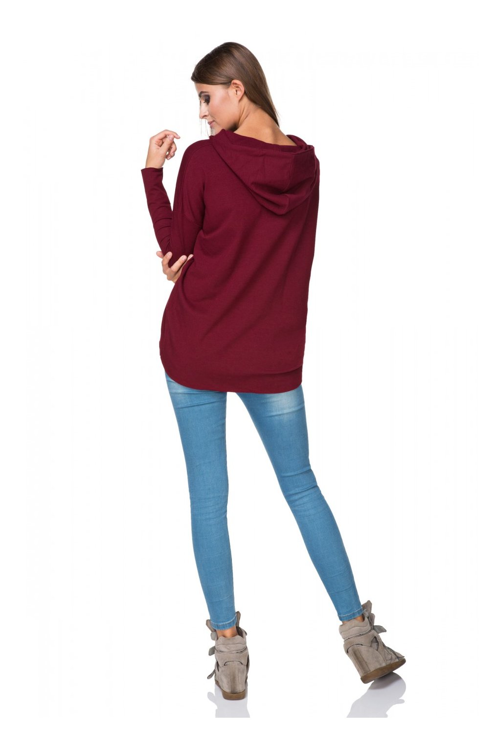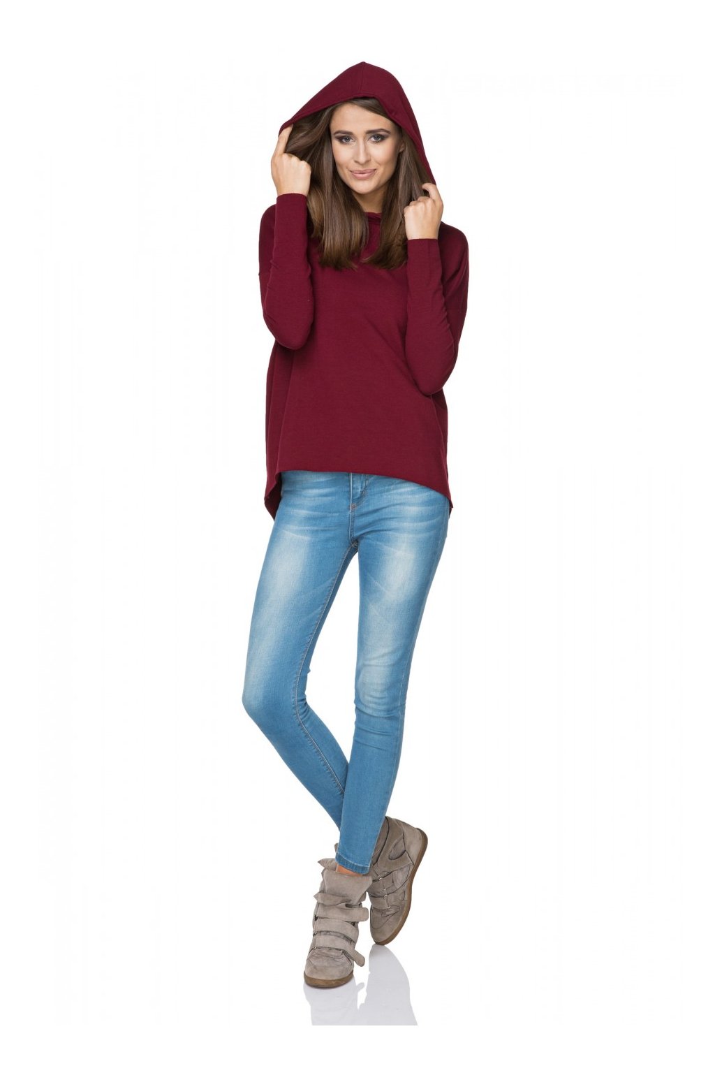Sportovní kimonová mikina s kapucí z pletené teplákoviny. Dlouhé rukávy. Mírně prodloužená zadní část. Rukávy a spodní část mikiny zůstaly nezpracované.