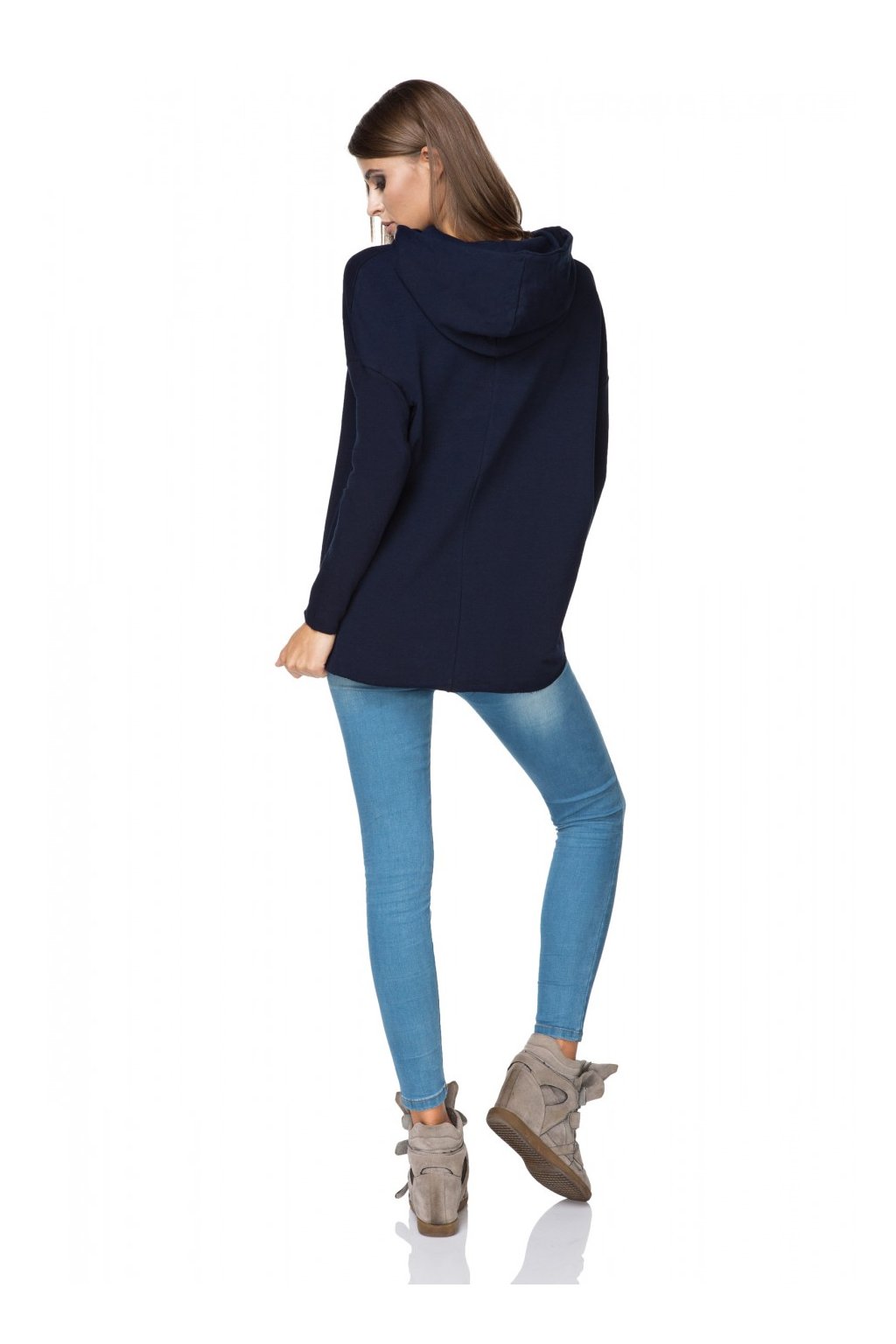 Sportovní kimonová mikina s kapucí z pletené teplákoviny. Dlouhé rukávy. Mírně prodloužená zadní část. Rukávy a spodní část mikiny zůstaly nezpracované.