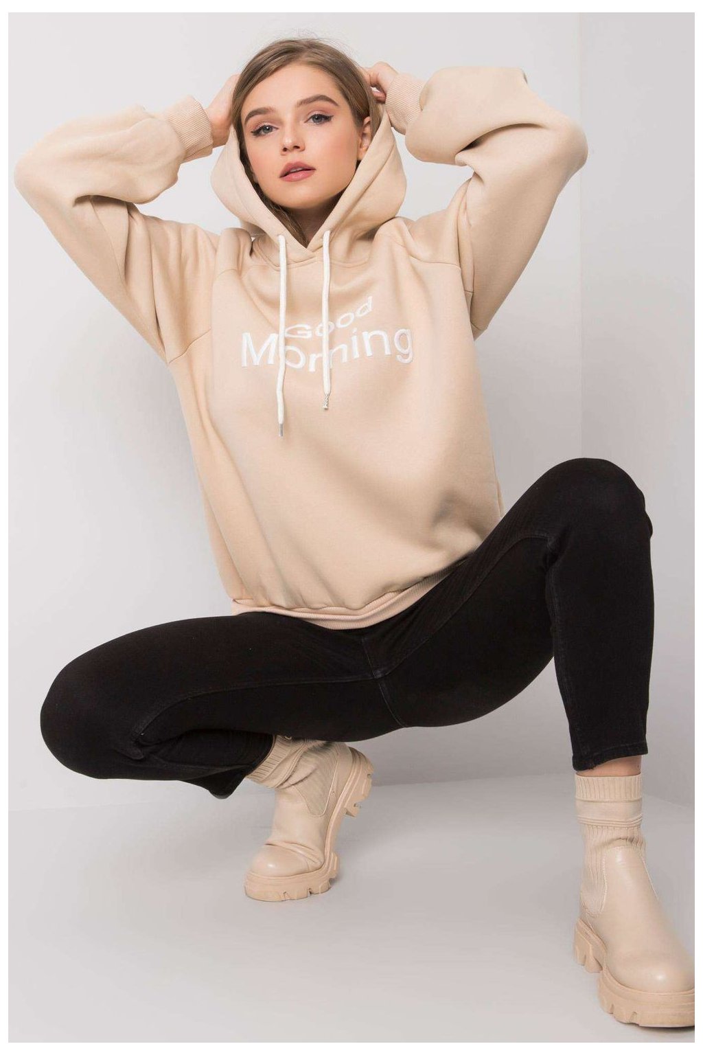 Béžová zateplená mikina s kapucí. Ideální pro každodenní nošení.