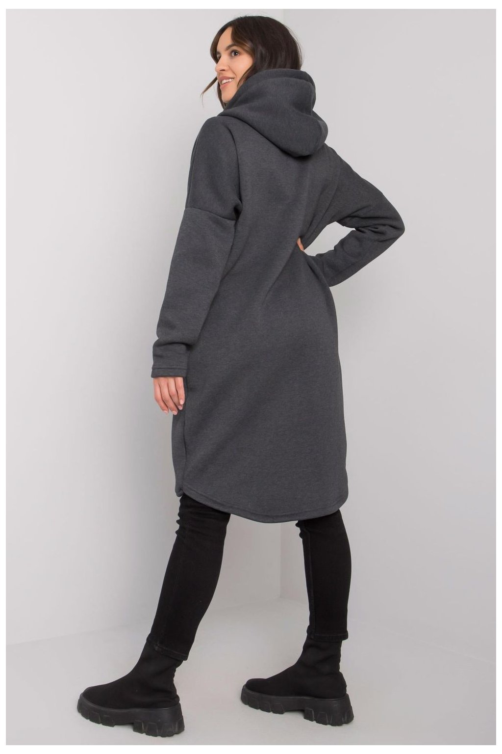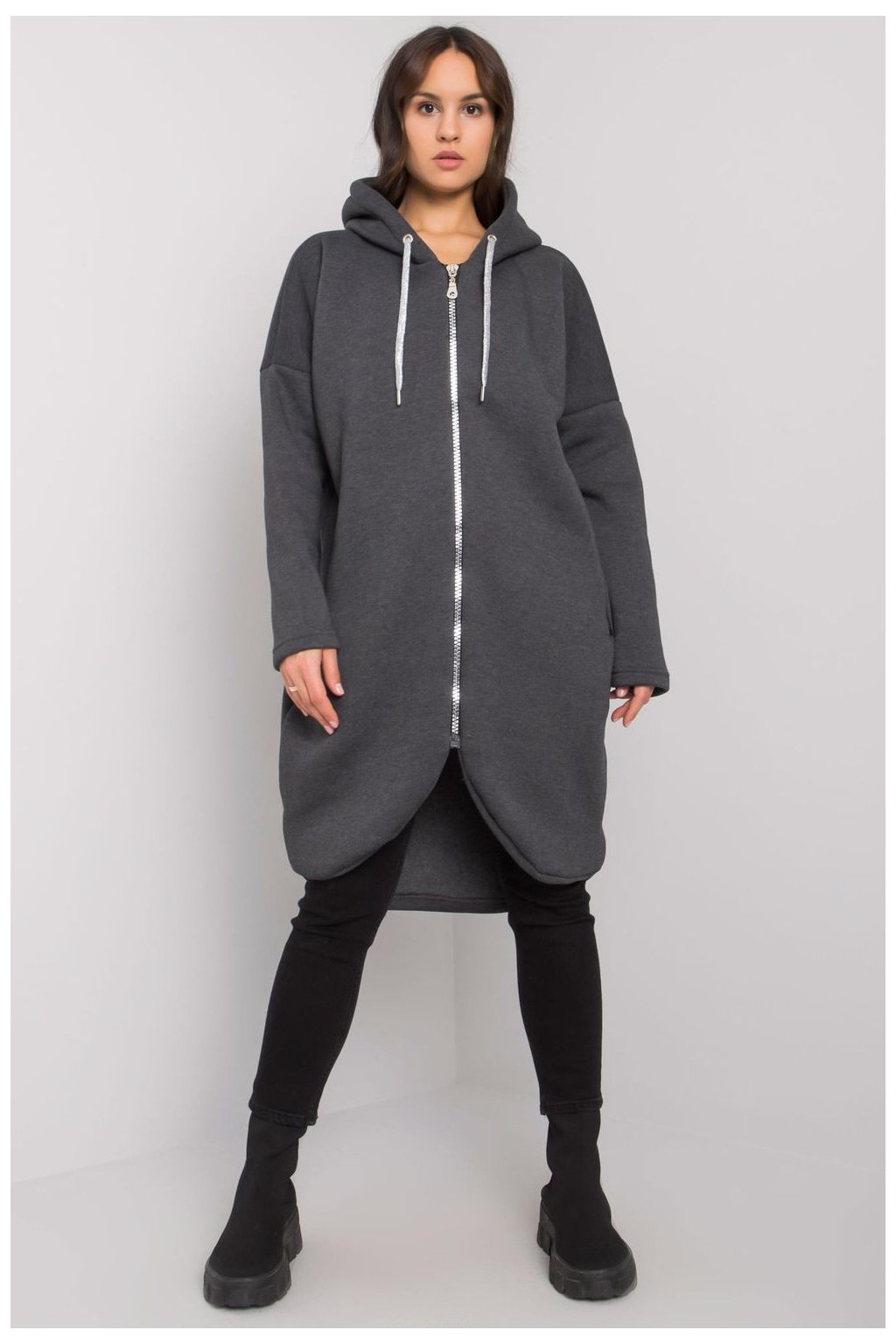 Dámská mikina s prodlouženým střihem a dlouhými rukávy. Mikina má asymetrickou spodní část, zapínání na zip a kapuci. Kapsy na zip po stranách.