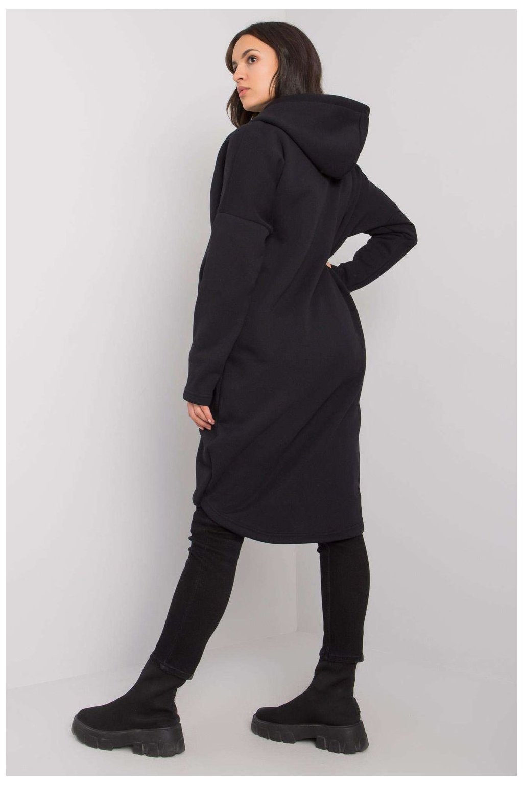 Dámská mikina s prodlouženým střihem a dlouhými rukávy. Mikina má asymetrickou spodní část, zapínání na zip a kapuci. Kapsy na zip po stranách.