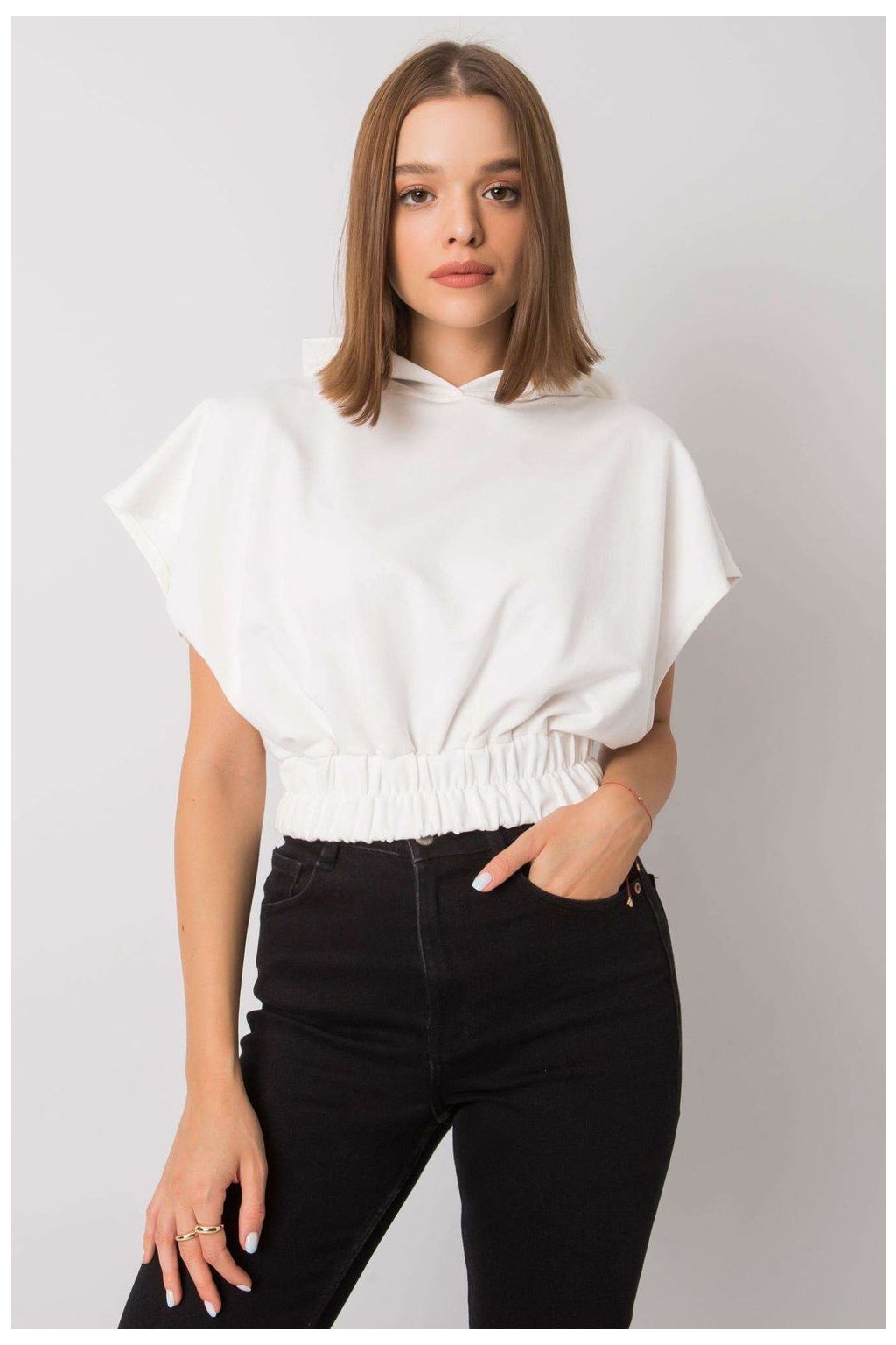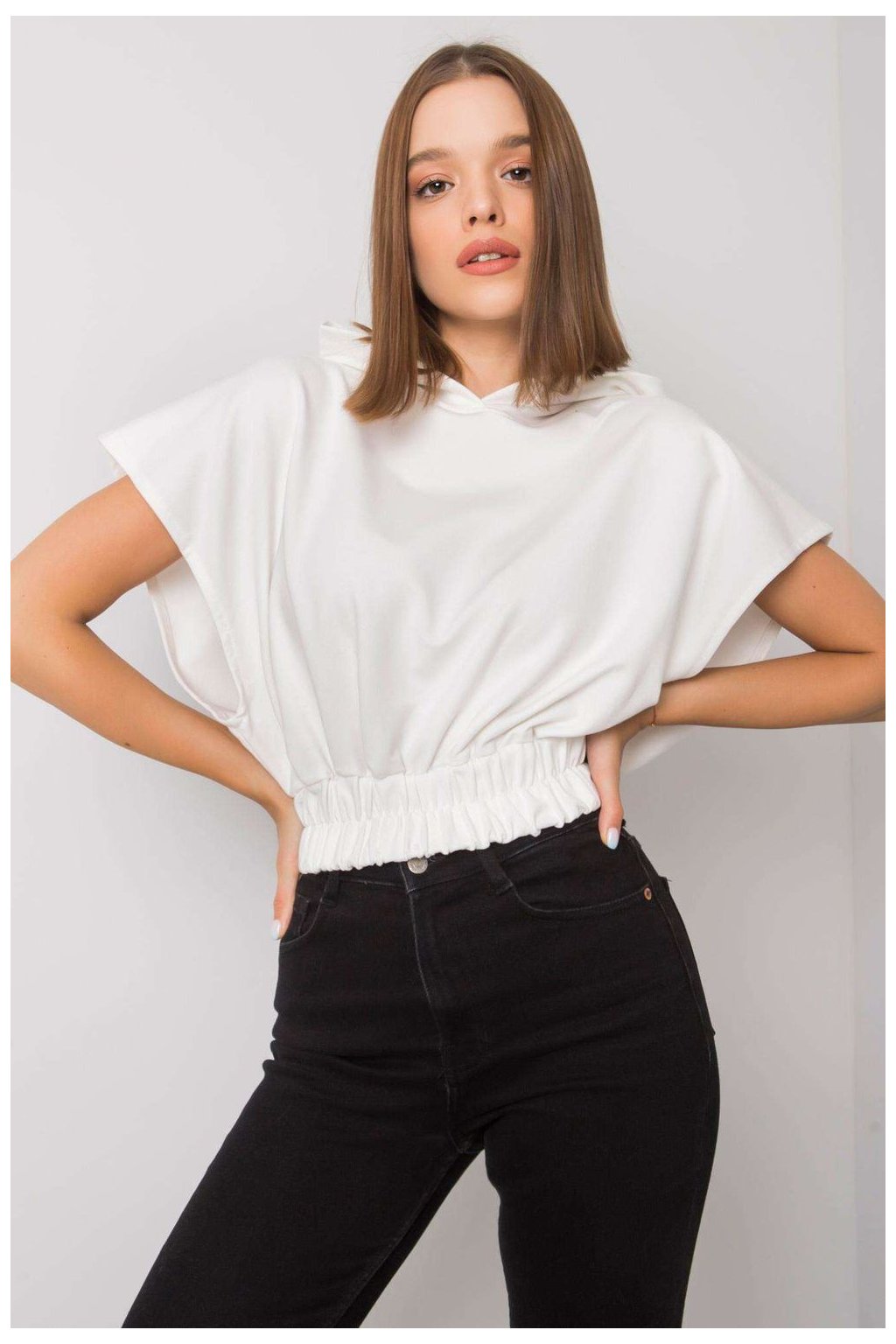 Dámská mikina volného střihu s krátkými rukávy a kapucí. Široká gumička ve spodní části.