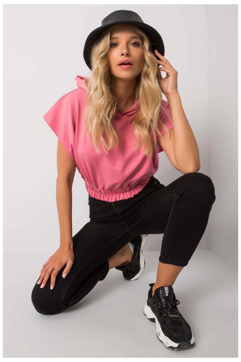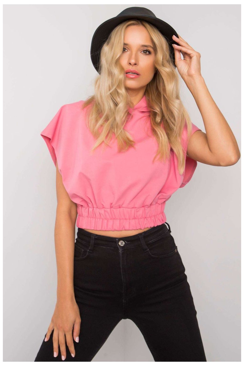 Dámská mikina volného střihu s krátkými rukávy a kapucí. Široká gumička ve spodní části.