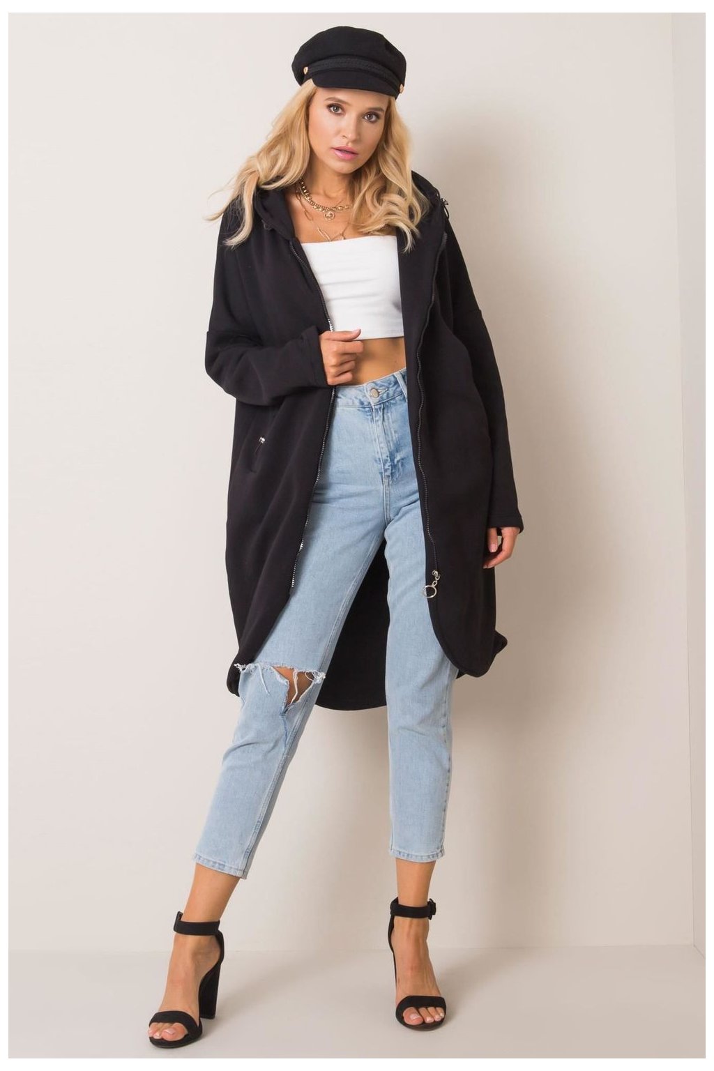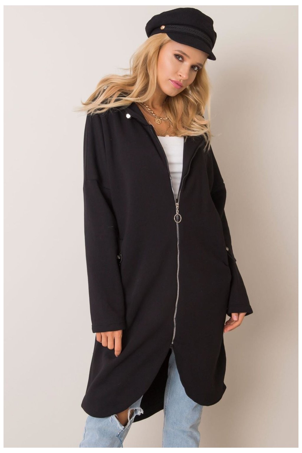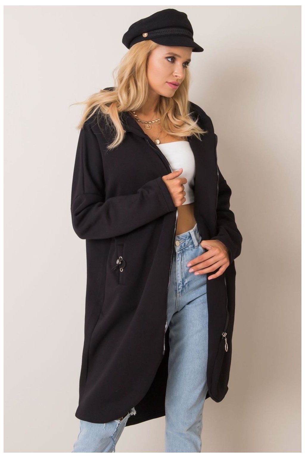Mikina s prodlouženým střihem a zapínáním na zip. Mikina s dlouhými rukávy a kapucí. Kapsy na bocích.