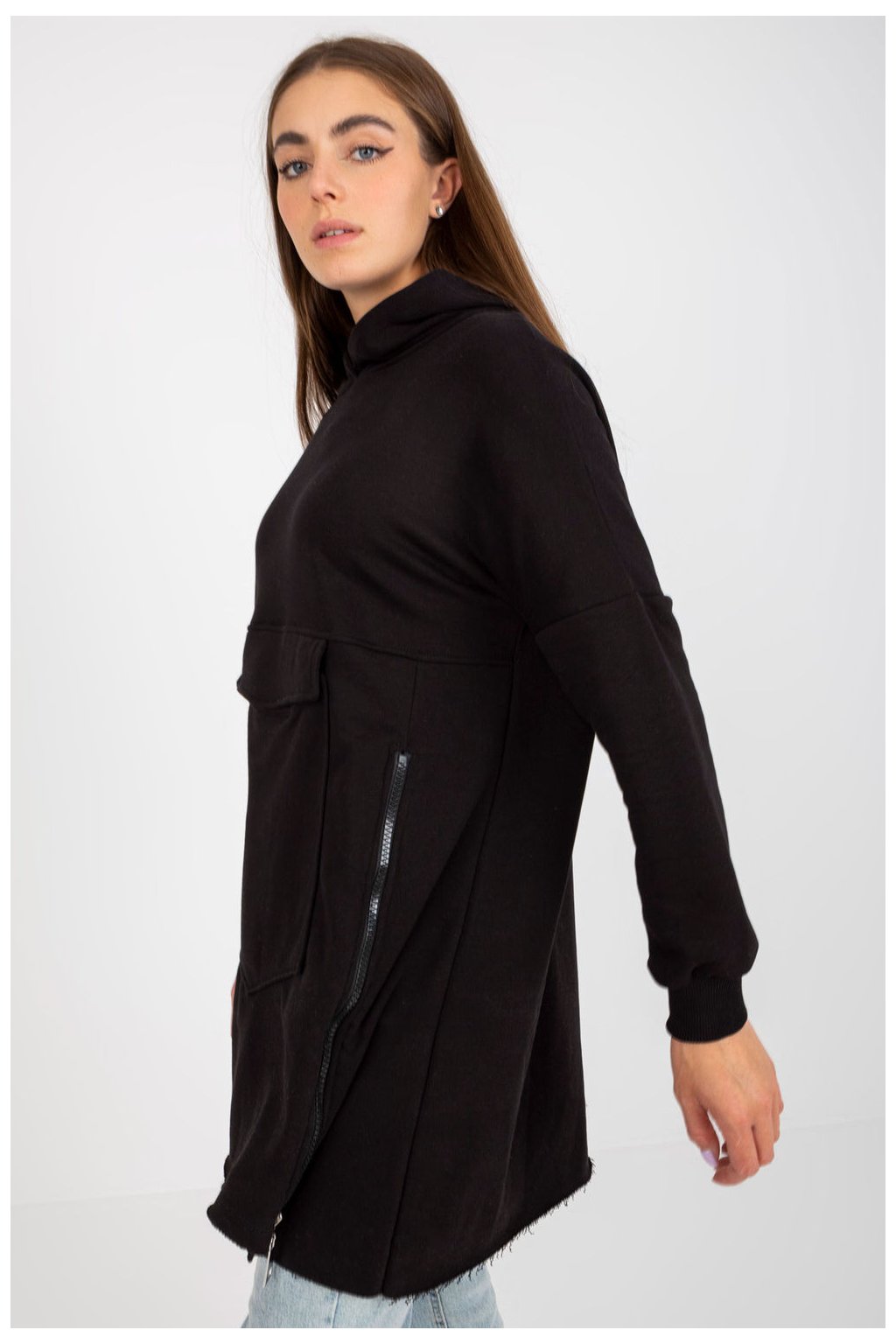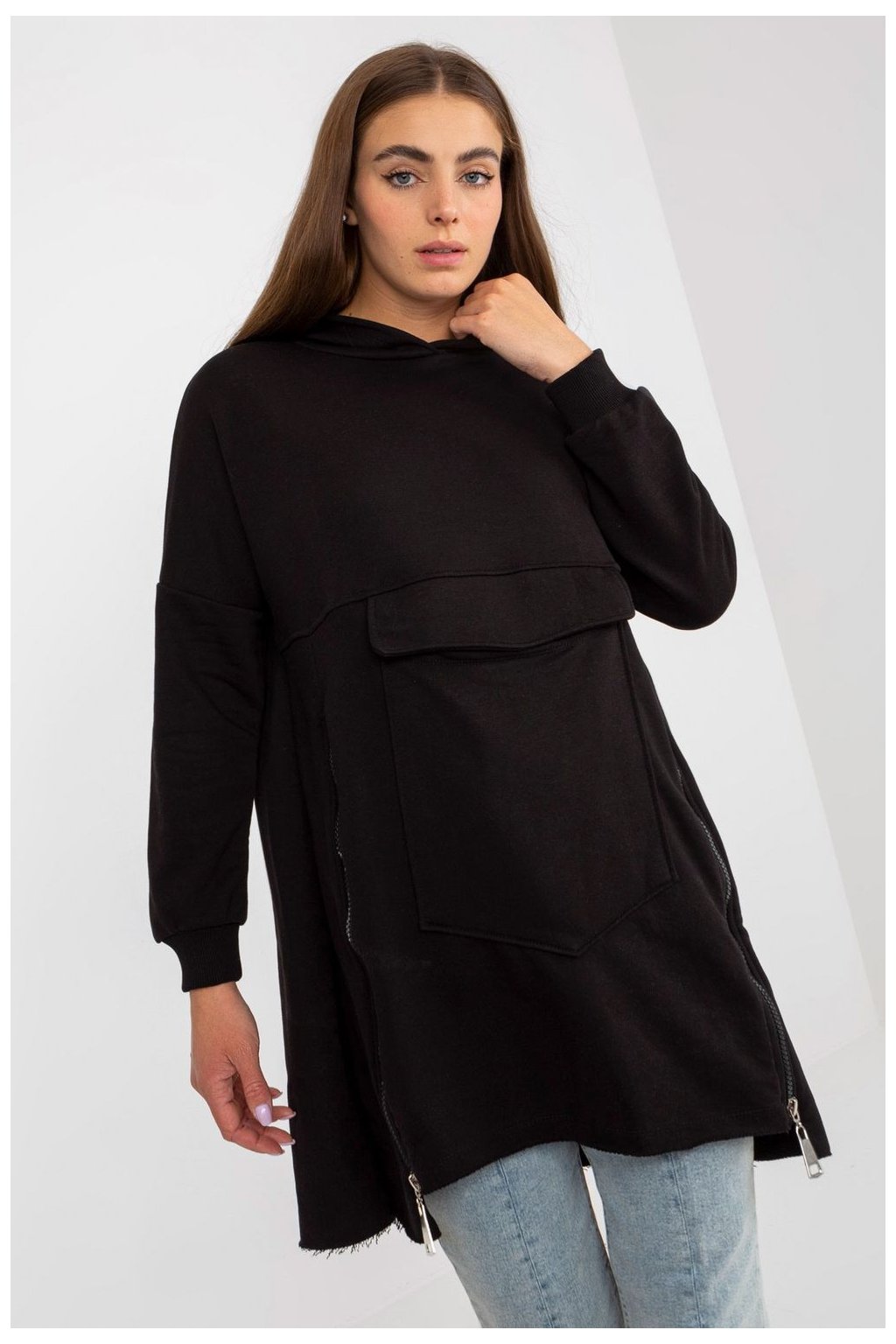 Mikina prodlouženého střihu s dlouhými rukávy a kapucí. Ozdobné zipy na bocích, velká kapsa na přední straně.