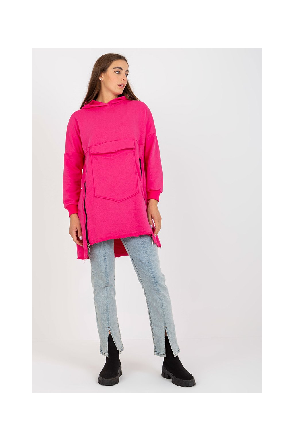 Mikina prodlouženého střihu s dlouhými rukávy a kapucí. Ozdobné zipy na bocích, velká kapsa na přední straně.
