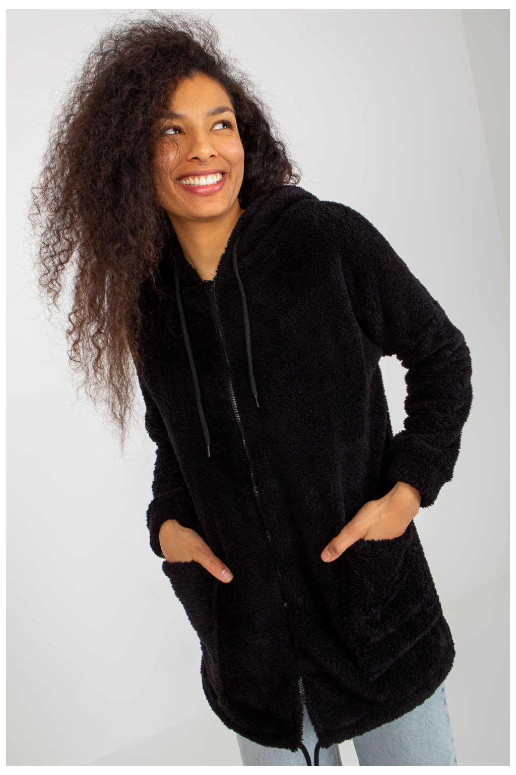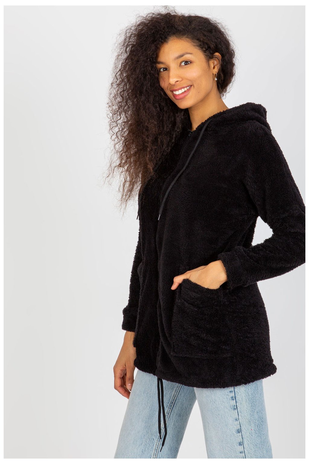 Kožešinová teplá mikina na zip s kapucí. Mikina má velké našité kapsy.