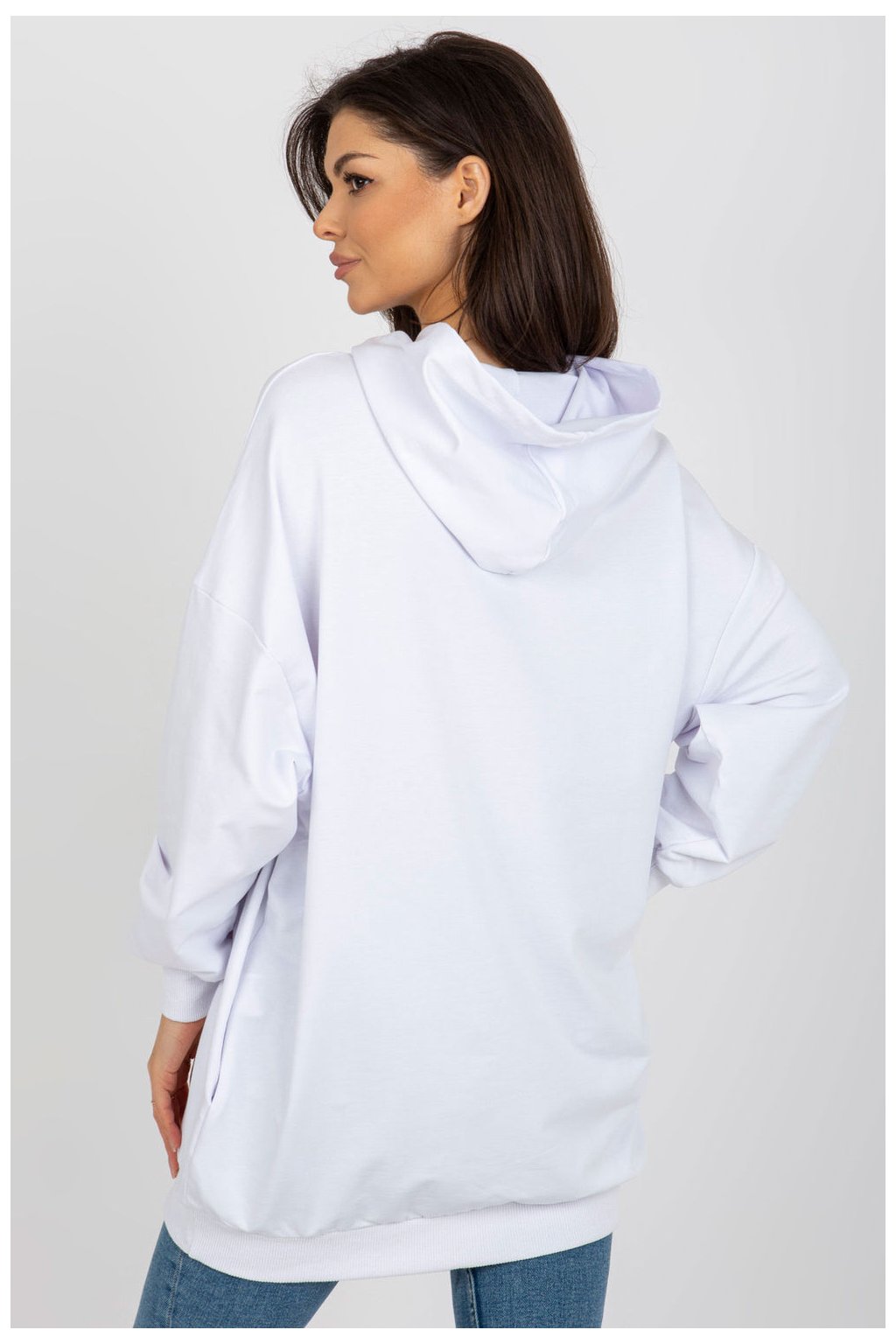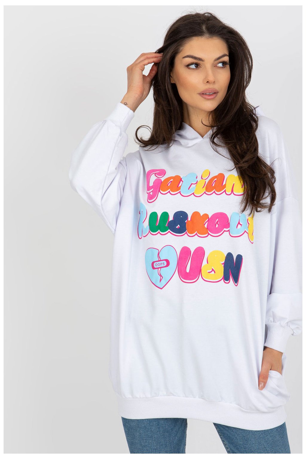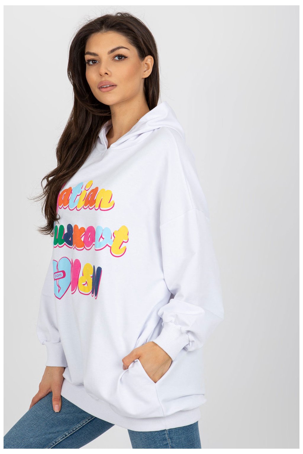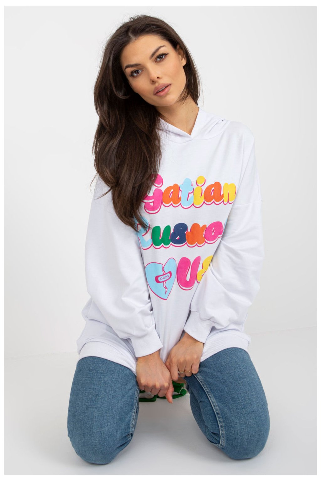 Dámská mikina rovného střihu s dlouhými rukávy a kapucí. Kapsy na bocích. Ozdobný nápis na přední straně.