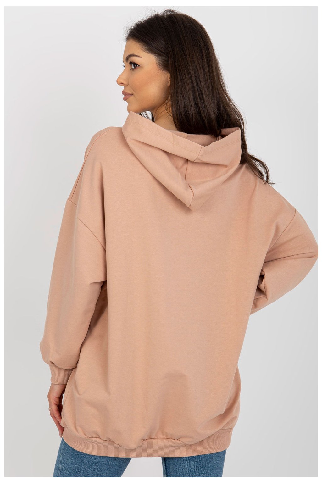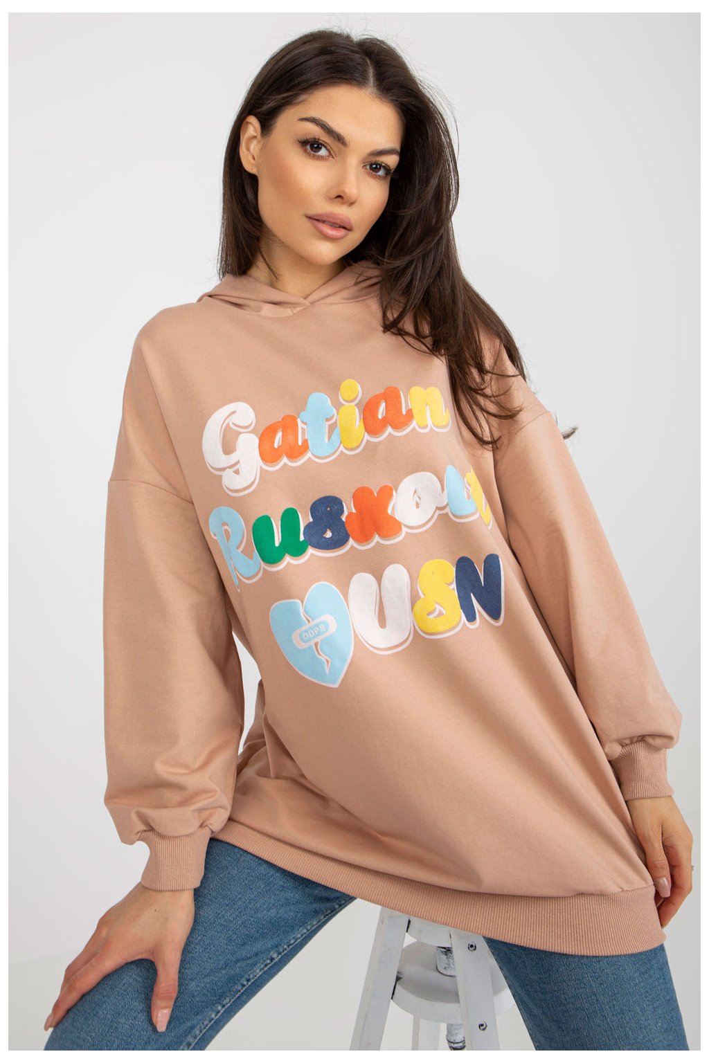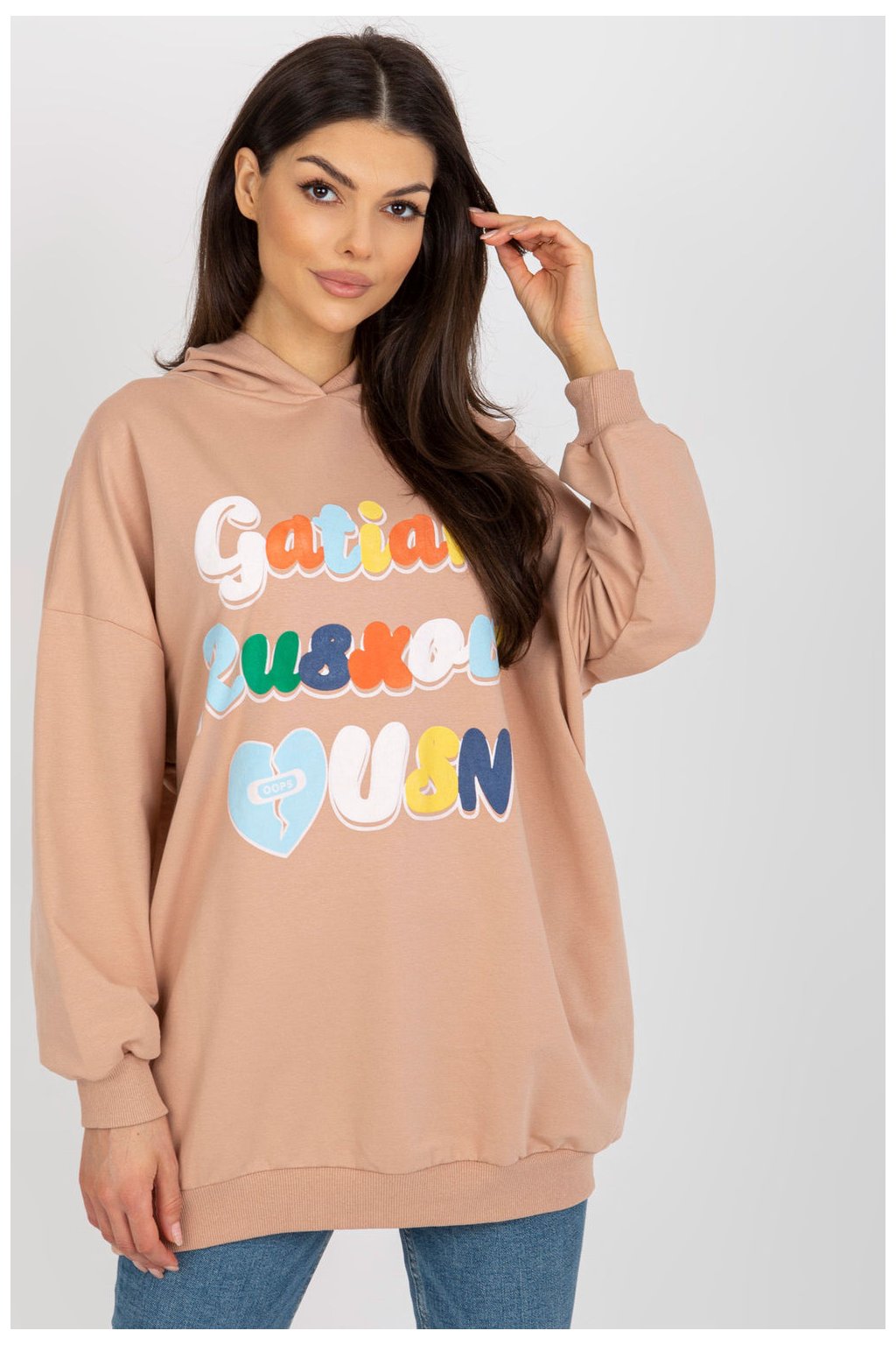 Dámská mikina rovného střihu s dlouhými rukávy a kapucí. Kapsy na bocích. Ozdobný nápis na přední straně.