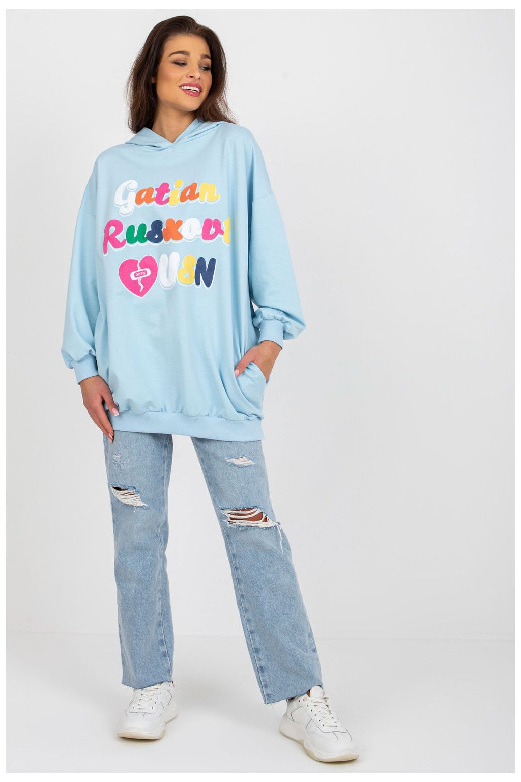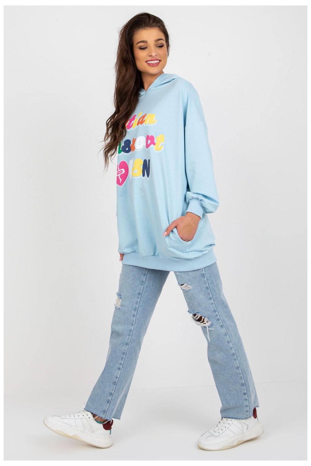 Dámská mikina rovného střihu s dlouhými rukávy a kapucí. Kapsy na bocích. Ozdobný nápis na přední straně.