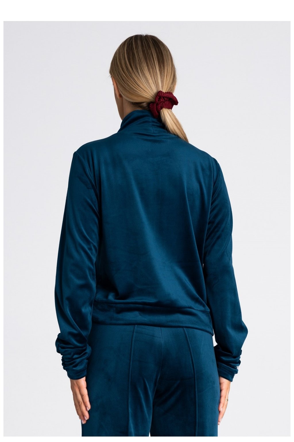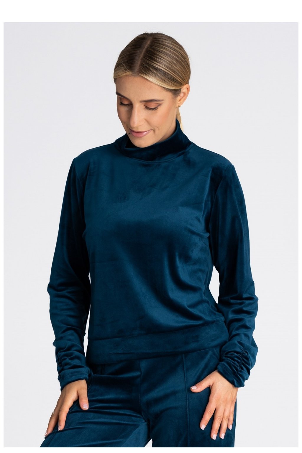 Dámská halenka ušitá z veluru. Má rolák a dlouhé rukávy zakončené dole pružným řasením.
