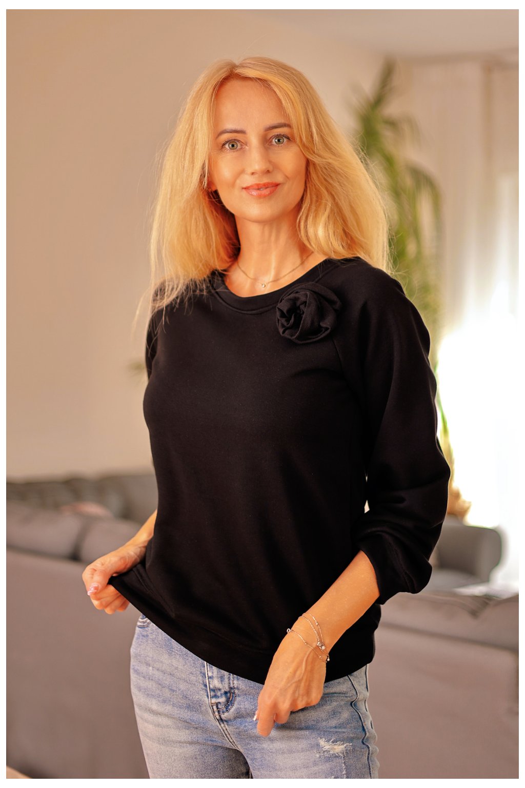 Bavlněná mikina Similan spojuje pohodlí s elegancí. Mikinu v klasickém lehce oversized střihu zdobí růže vyrobená z té samé bavlněné látky. Růže má zapínání, díky kterému může, ale nemusí být součástí outfitu. Rukávy a spodní lem mikiny jsou zakončeny manžetami. Model Similan se hodí k teplákovým kalhotám, džínám nebo sukní.