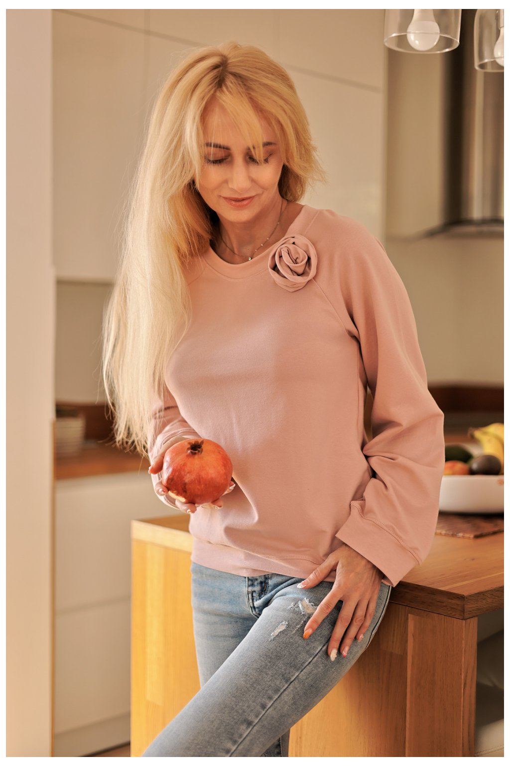 Bavlněný svetr Similan spojuje pohodlí s elegancí. Svetr s klasickým lehce oversized střihem zdobí růže vyrobená ze stejné bavlněné pleteniny. Růže má sponu, díky které může, ale nemusí být součástí stylizace. Rukávy a spodní lem svetru jsou zakončeny manžetami. Model Similan se hodí k teplákovým kalhotám, džínům nebo sukni.