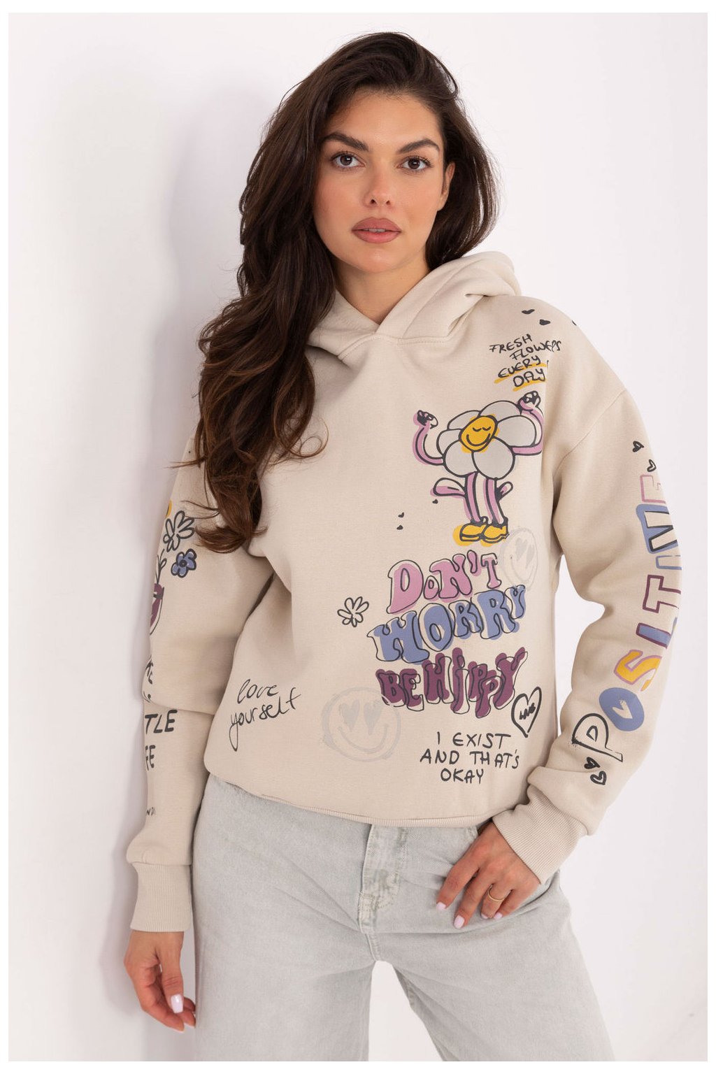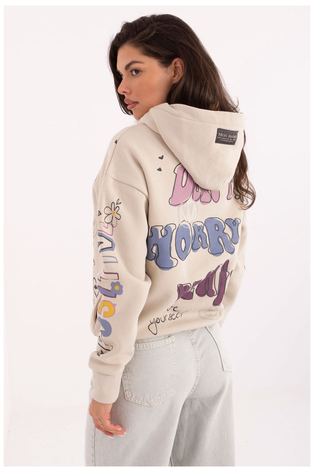 Dámská mikina v casual stylu, ideální na každodenní příležitosti. Vyrobená z směsi bavlny a polyesteru, poskytuje pohodlí a příjemné teplo. Model s standardní délkou s dlouhými rukávy a praktickými kapsami vsunutými do bočních švů. Charakteru dodává potisk spolu s nápisy pokrývající celou plochu mikiny, s výjimkou kapuce, na které se nachází subtilní nášivka.