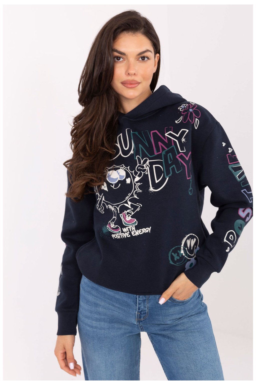 Dámská mikina v casual stylu, ideální na každodenní příležitosti. Vyrobená z směsi bavlny a polyesteru, poskytuje pohodlí a příjemné teplo. Standardní délka s dlouhými rukávy a praktickými kapsami vsunutými do bočních švů. Charakteru dodává potisk spolu s nápisy pokrývající celou plochu mikiny, s výjimkou kapuce, na které je umístěn jemný nápis.