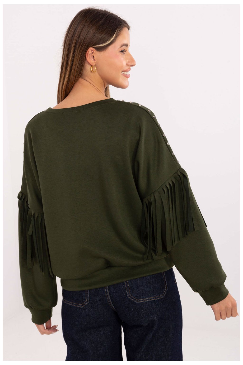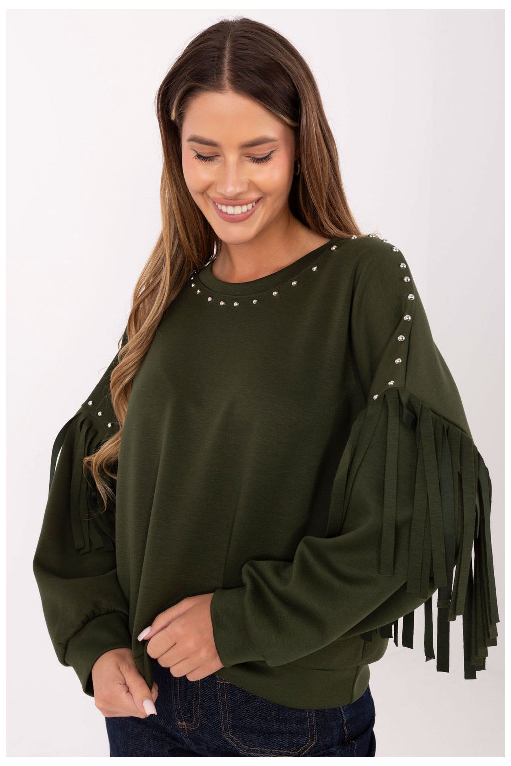 Dámská volně střižená blůza v hladkém provedení je stylovým návrhem na každý den. Vyrobená z měkké směsi viskózy a polyesteru poskytuje pohodlí a pohodlí po celý den. Klasický, kulatý výstřih byl ozdoben decentními nýty, které celku dodávají moderní charakter. Dlouhý rukáv s efektními šňůrkami a aplikací nýtů dělá z blůzy výrazný prvek každodenních outfitů. Standardní délka a absenci zapínání ji dělají praktickým, ale zároveň originálním kouskem šatníku.