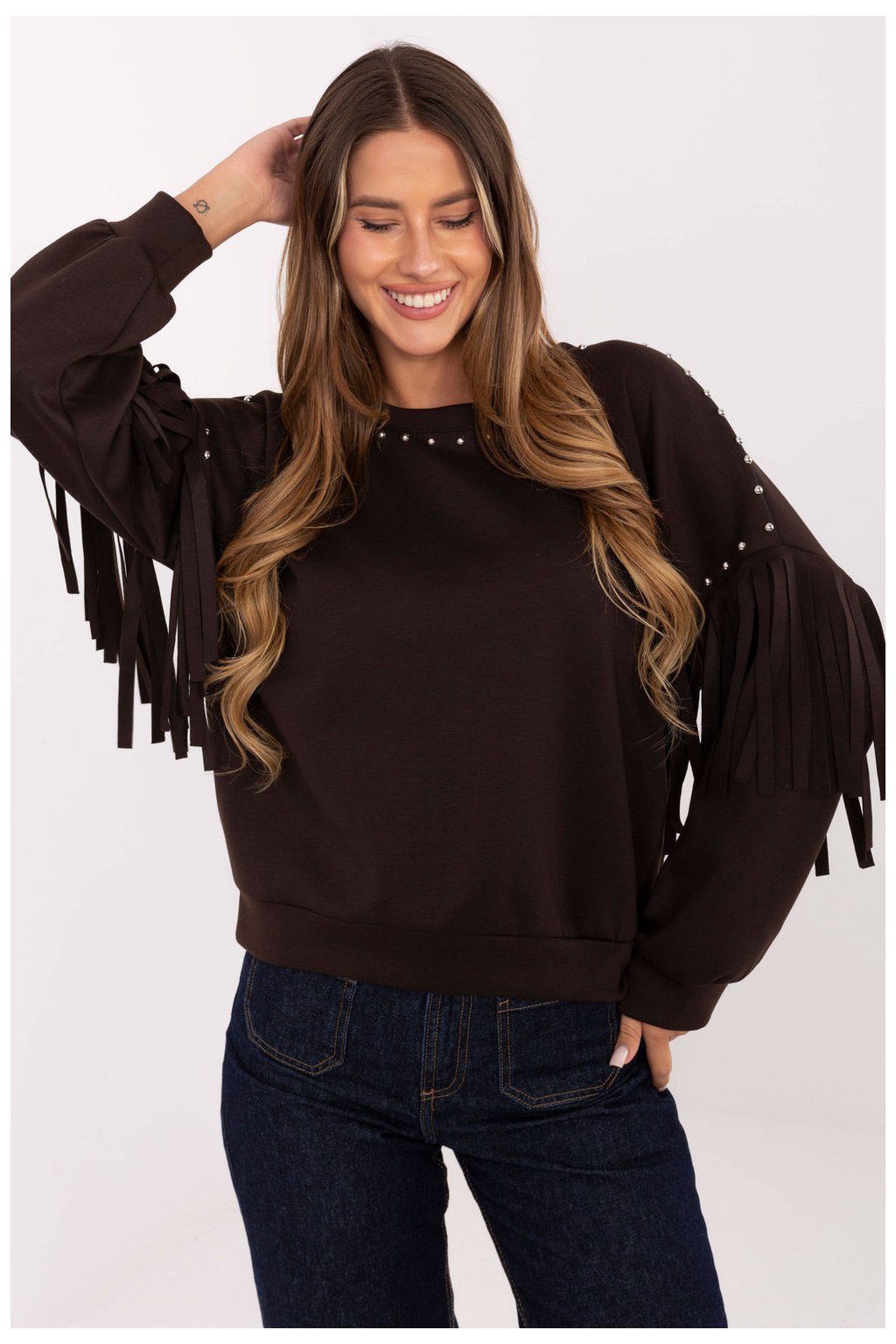 Dámská casual blůza v hladkém provedení je stylovým návrhem na každý den. Vyrobená z měkké směsi viskózy a polyesteru poskytuje pohodlí a pohodlí po celý den. Klasický, kulatý výstřih byl ozdoben jemnými nitěmi, které dodávají celku moderní charakter. Dlouhý rukáv s efektními trojúhelníky a aplikací nití dělají z blůzy výrazný prvek v každodenních stylizacích. Standardní délka a absenci zapínání ji dělají praktickým, ale zároveň originálním kouskem šatníku.