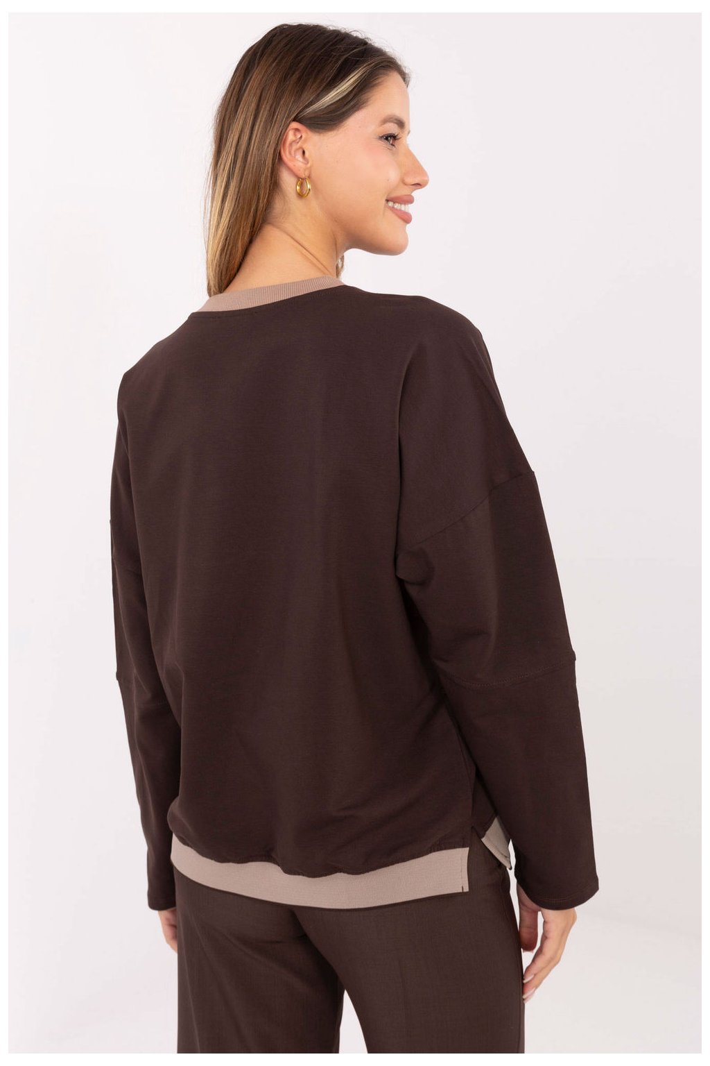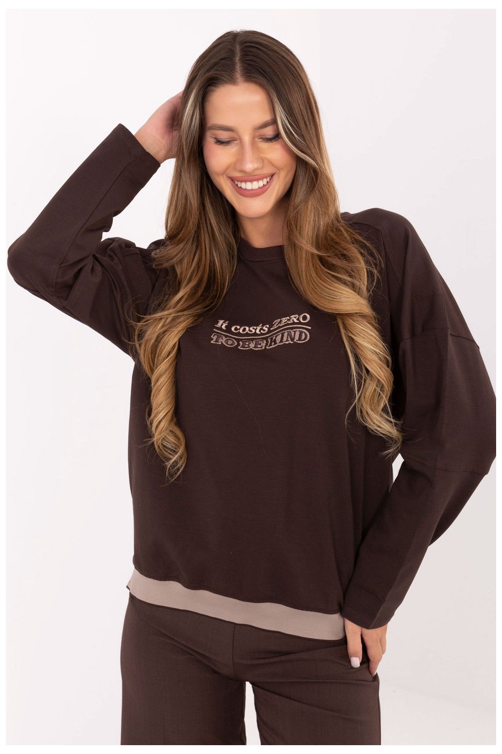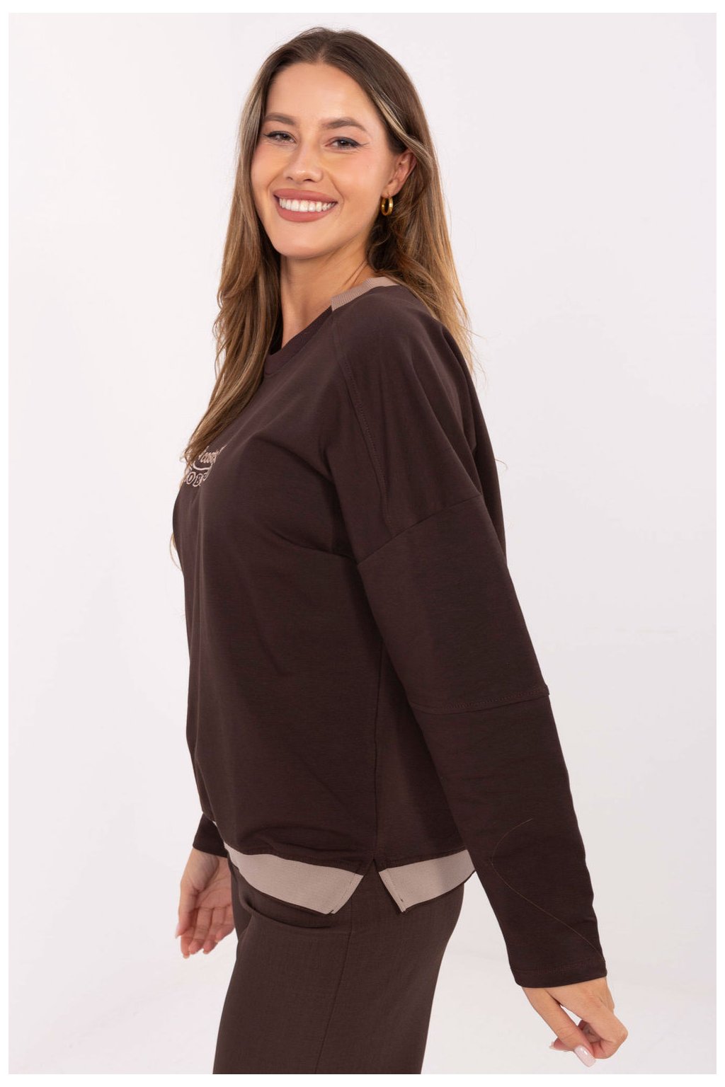 Moderní dámská mikina v casual stylu je ideální kombinací pohodlí a módního designu. Vyrobená z měkké a elastické směsi bavlny a elastanu, poskytuje pohodlí po celý den. Model standardní délky s dlouhými rukávy má kulatý výstřih a není zapínán, co zdůrazňuje jeho volný charakter. Přední část mikiny zdobí vyšívané nápisy, které jí dodávají originální vzhled, a kontrastní vložka dole je módním detail, který tento model odlišuje od klasických střihů. Je to skvělý návrh pro ženy, které oceňují pohodlí, styl a decentní ozdoby ve svých každodenních stylizacích.