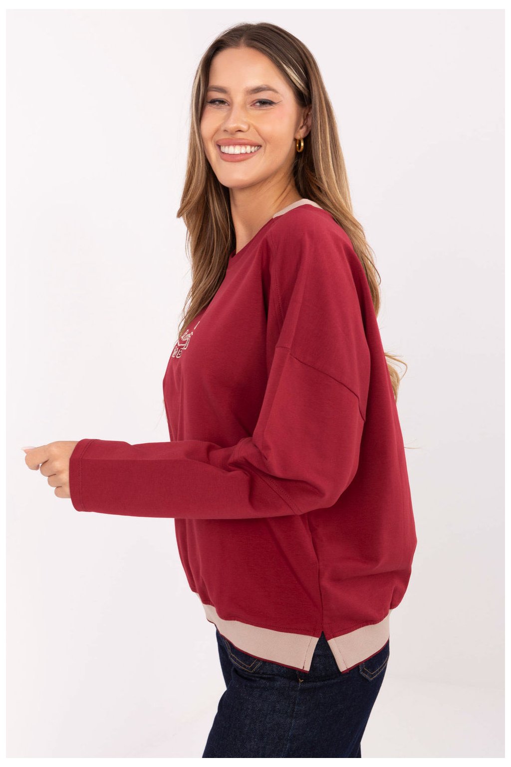 Moderní dámská mikina ve stylu casual je ideální kombinací pohodlí a módního designu. Vyrobená z měkké a elastické směsi bavlny a elastanu poskytuje pohodlí po celý den. Model s standardní délkou a dlouhými rukávy má kulatý výstřih a není zapínán, což zdůrazňuje jeho volný charakter. Přední část mikiny zdobí vyšívané nápisy, které jí dodávají originální vzhled, a kontrastní vložka dole je módním detailem, který tento model odlišuje od klasických střihů. Jedná se o skvělý návrh pro ženy, které ocení pohodlí, styl a decentní ozdoby ve svých každodenních outfitech.