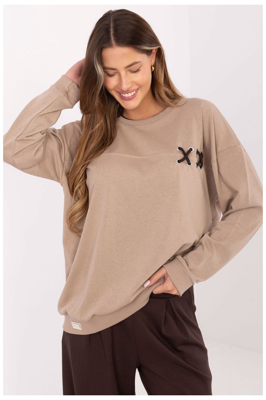 Svetr pro dámy ve velikosti oversize je ideální kombinací pohodlí a módního stylu na každý den. Vyrobený z měkké směsi bavlny a polyesteru, je příjemný na dotek, odolný a skvěle padne na postavě. Volný střih poskytuje plnou volnost pohybu a pletená ozdoba vpředu jí dodává originální, stylový charakter. Model má kulatý výstřih a dlouhé rukávy, co z ní činí skvělou volbu pro chladnější dny. Absence zapínání zdůrazňuje ležérní, volný charakter svetru a standardní délka umožňuje snadné kombinování s džíny, legíny nebo teplákovými kalhoty.