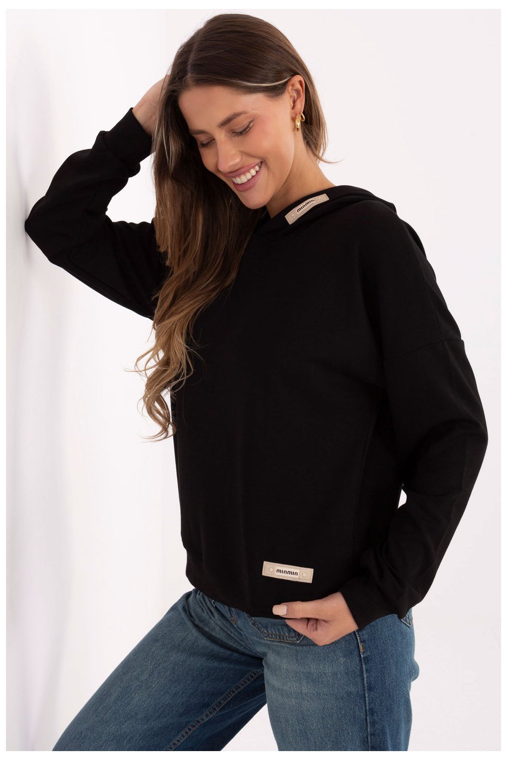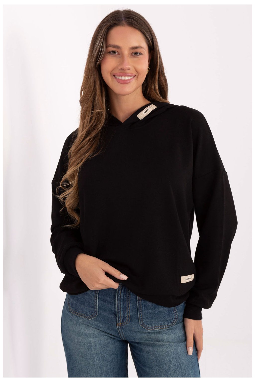 Elegantní dámská mikina s ležérním charakterem, ideální na každý den. Vyrobená z příjemné směsi viskózy, polyesteru a elastanu, poskytuje pohodlí, pružnost a trvanlivost. Model s standardní délkou, dlouhým rukávem a kapucí je klasika v moderním provedení. Hladký materiál dělá mikinu univerzální a snadno kombinovatelnou, zatímco ozdobné nášivky dole a na kapuci ji dodávají originální, módní akcent. Bez zapínání zaručuje volnost a pohodlí při nošení. Ideální s džíny, legíny nebo teplákovými kalhotami, skvělý návrh pro každodenní volné outfit.