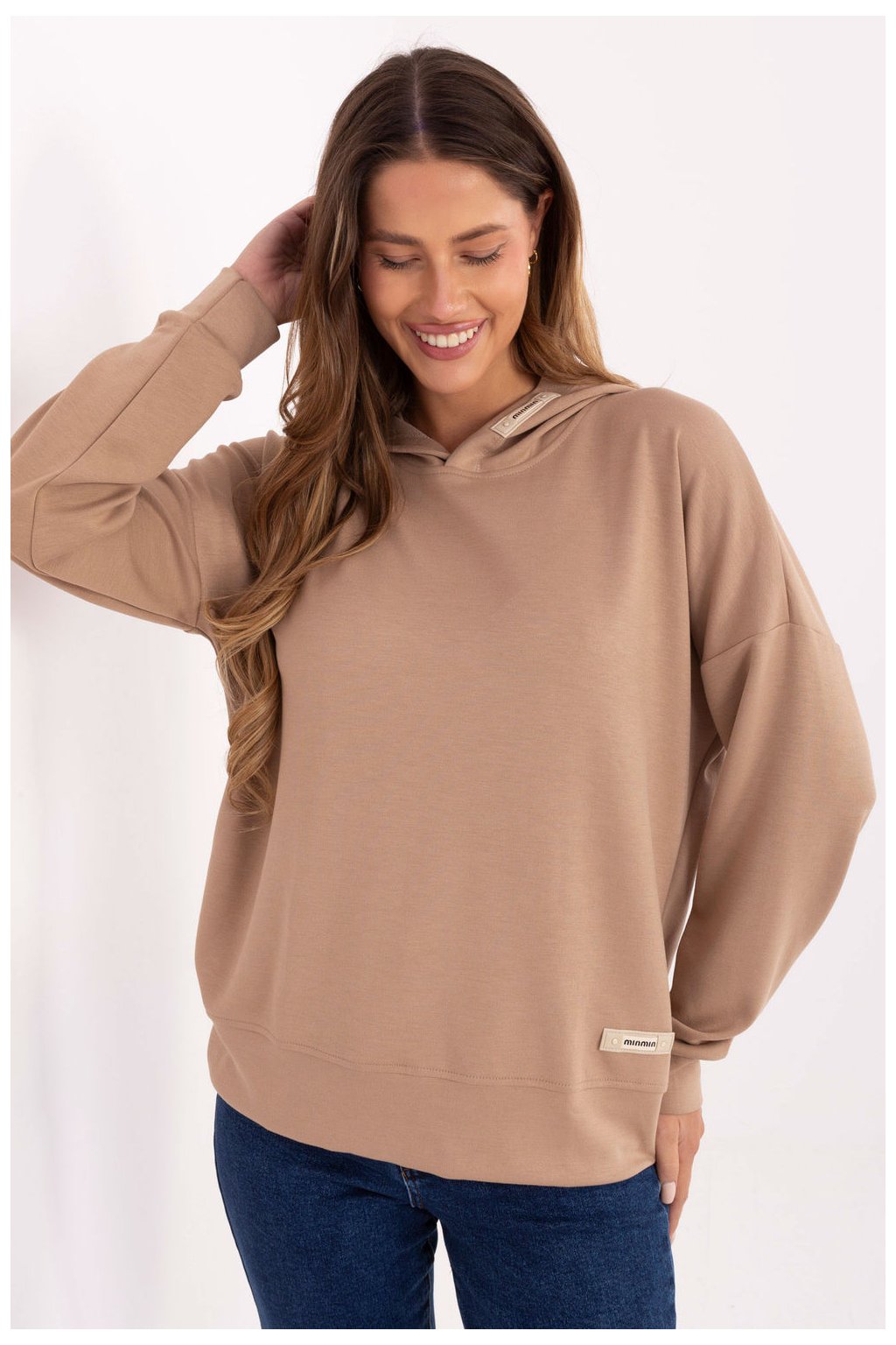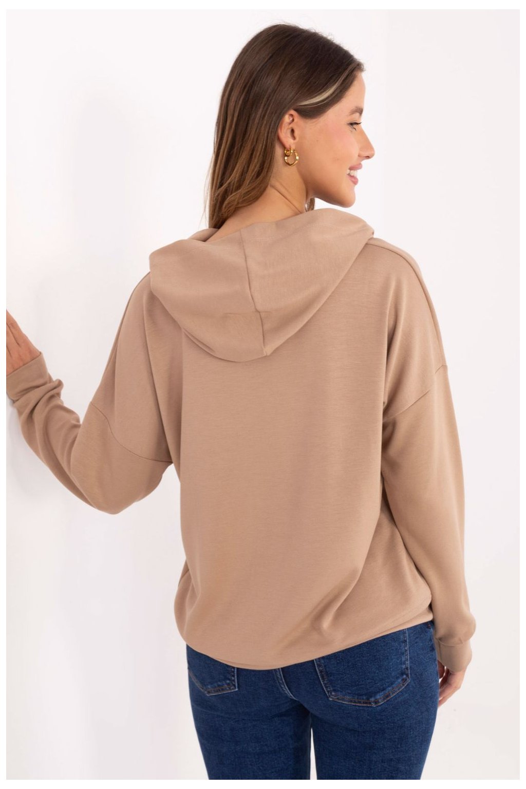 Elegantní dámská mikina s ležérním charakterem, ideální na každý den. Vyrobená z příjemné směsi viskózy, polyesteru a elastanu, poskytuje pohodlí nošení, pružnost a odolnost. Model s standardní délkou, dlouhým rukávem a kapucí je klasikou v moderním provedení. Hladký materiál dělá mikinu univerzální a snadno kombinovatelnou, zatímco ozdobné nášivky na spodním lemě a na kapuci jí dodávají originální, módní akcent. Bez zapínání zaručuje volnost a pohodlí při nošení. Ideální ke kalhotám, legínám nebo teplákovým kalhotám, skvělý návrh na každodenní, volné styly.