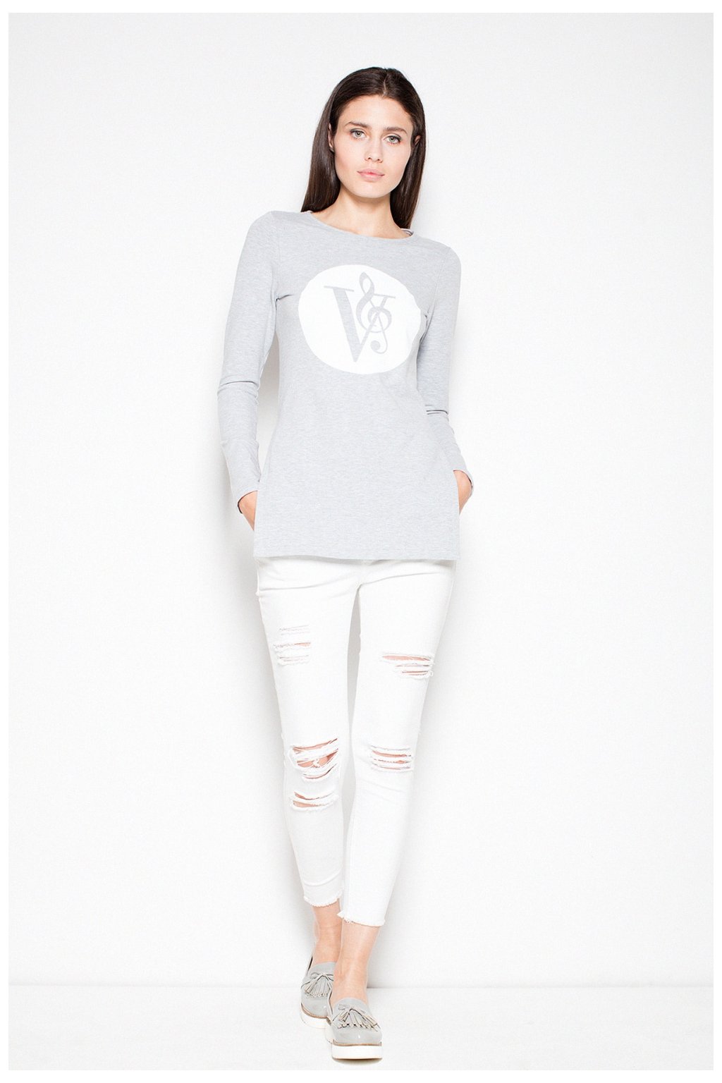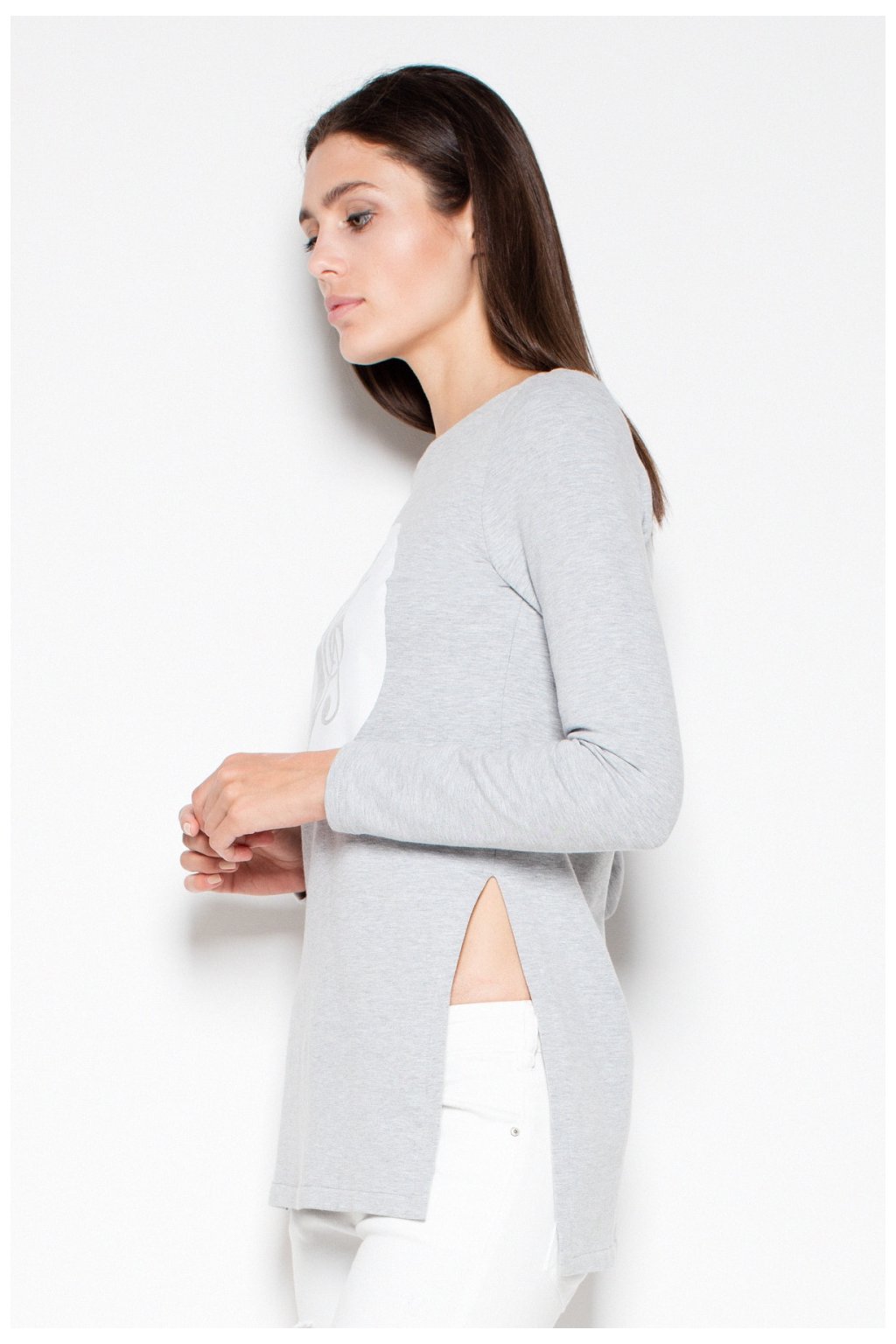 Asymetrická mikina úzkého střihu s originálním potiskem. Rozparek na bocích. Skvěle se hodí pro každodenní styling.