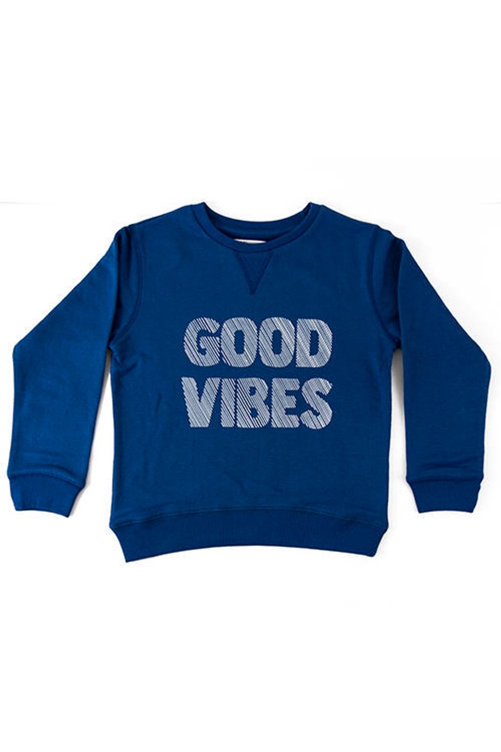 Modrá chlapecká mikina přes hlavu a bez kapuce s nápisem na přední straně.