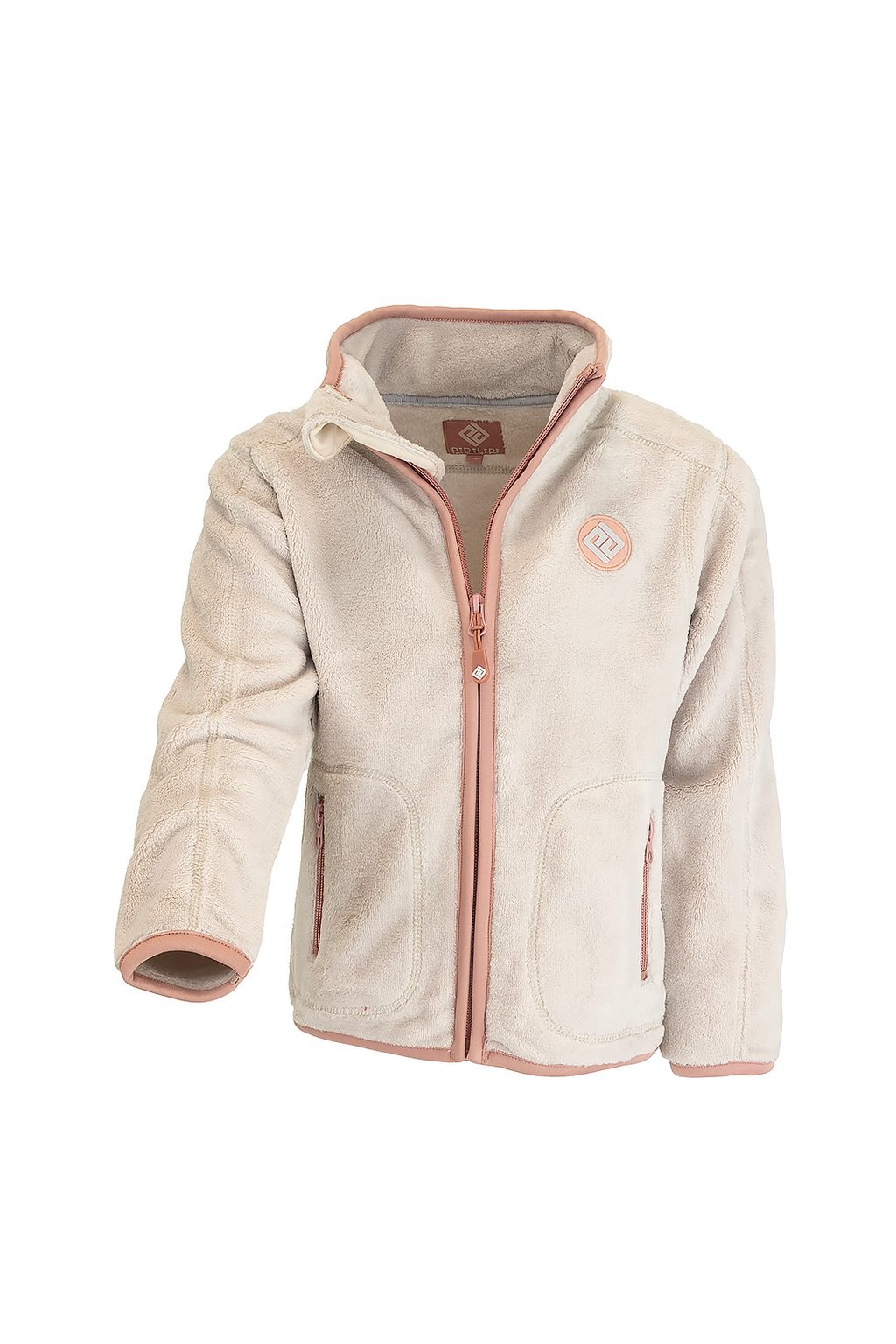 Dětská propínací chlupatá mikina v béžové barvě. Stojací límec, dvě kapsy, barevné kontrastní lemy.