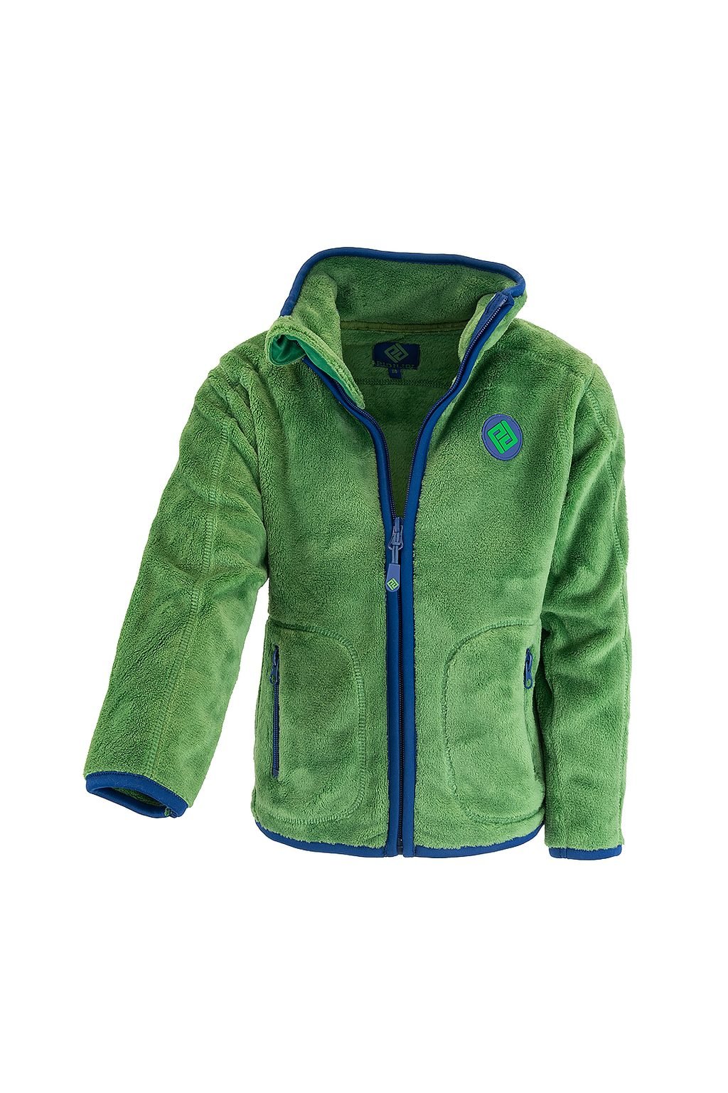 Dětská propínací chlupatá mikina v zelené barvě. Stojací límec, dvě kapsy, barevné kontrastní lemy.