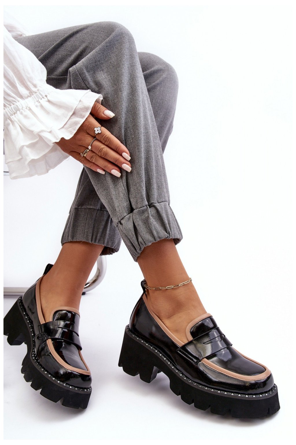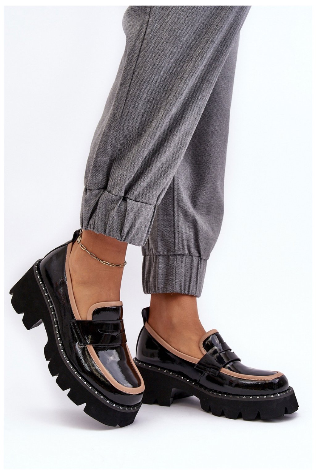 Dámské mokasíny byly vyrobeny z ekologické kůže. Mají ozdobný pásek s výřezem na přední straně. Tento model byl usazen na plochém podpatku a platformě, která byla navíc zdobena cvočky. Mokasíny mají stélku z přírodní kůže. Tento model se skvěle hodí pro jarní a podzimní sezónu!