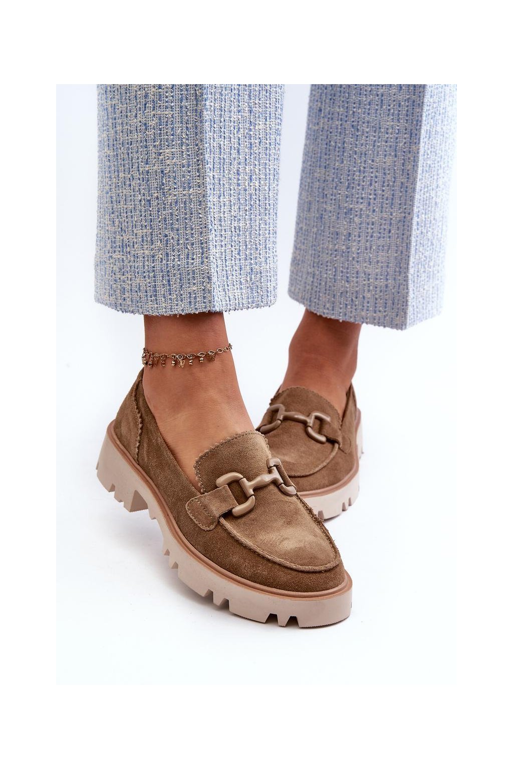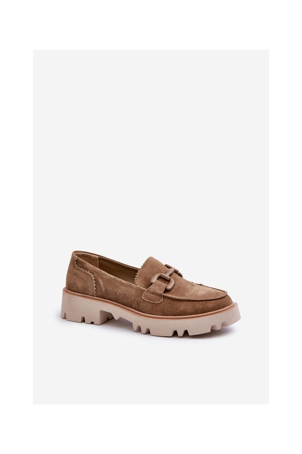 Dámské mokasíny vyrobené z přírodní semišové kůže. Umístěné na plochém podpatku. Další ozdobný prvek vepředu jim dodává výjimečné kouzlo, díky čemu jsou originálním doplňkem každého outfitu. Bez ohledu na to, zda se chystáte na setkání s přáteli nebo na formálnější událost, tyto mokasíny budou ideálním doplňkem Vašeho vzhledu, dodávající mu jemnou eleganci.