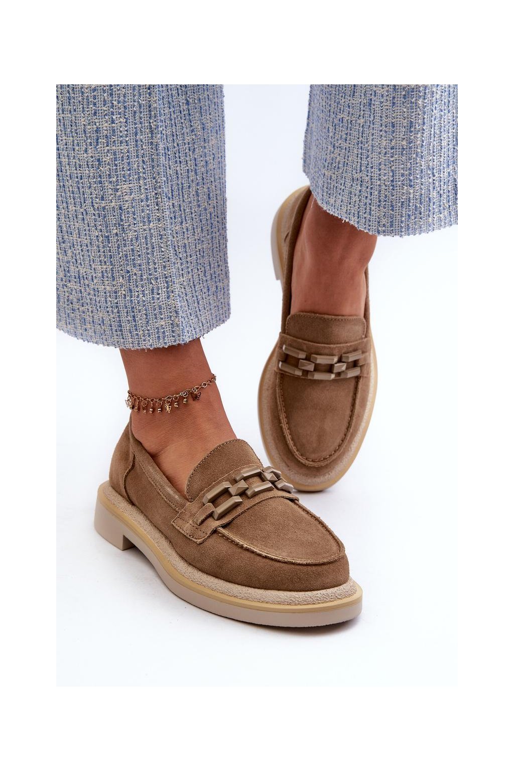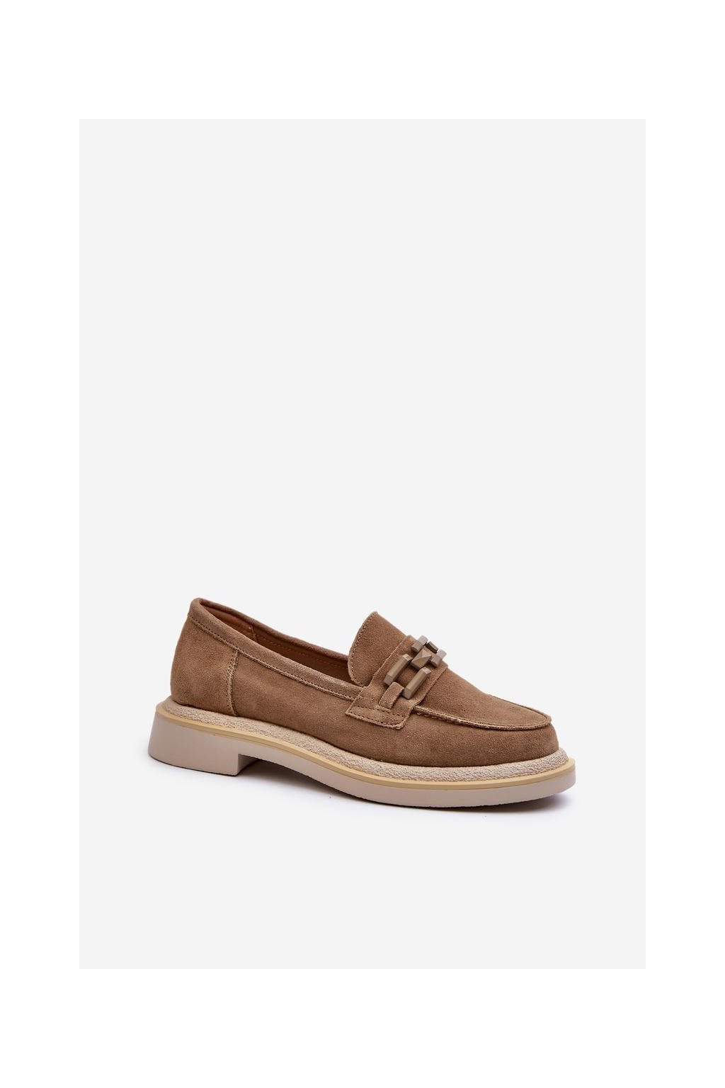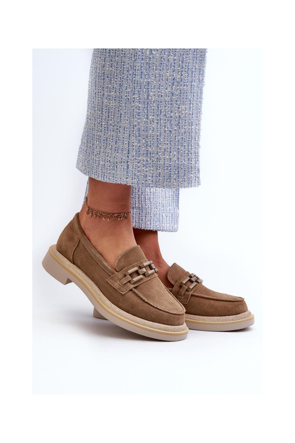 Dámské mokasíny vyrobené z přírodní semiše. Plochý podpatek zaručuje stabilitu a pohodlí při chůzi. Další ozdobný prvek vpředu jim dodává originalitu, což je činí nejen praktickými, ale také módními. Tyto mokasíny budou ideálním doplňkem mnoha různých stylů, jak ležérních, tak i elegantnějších.